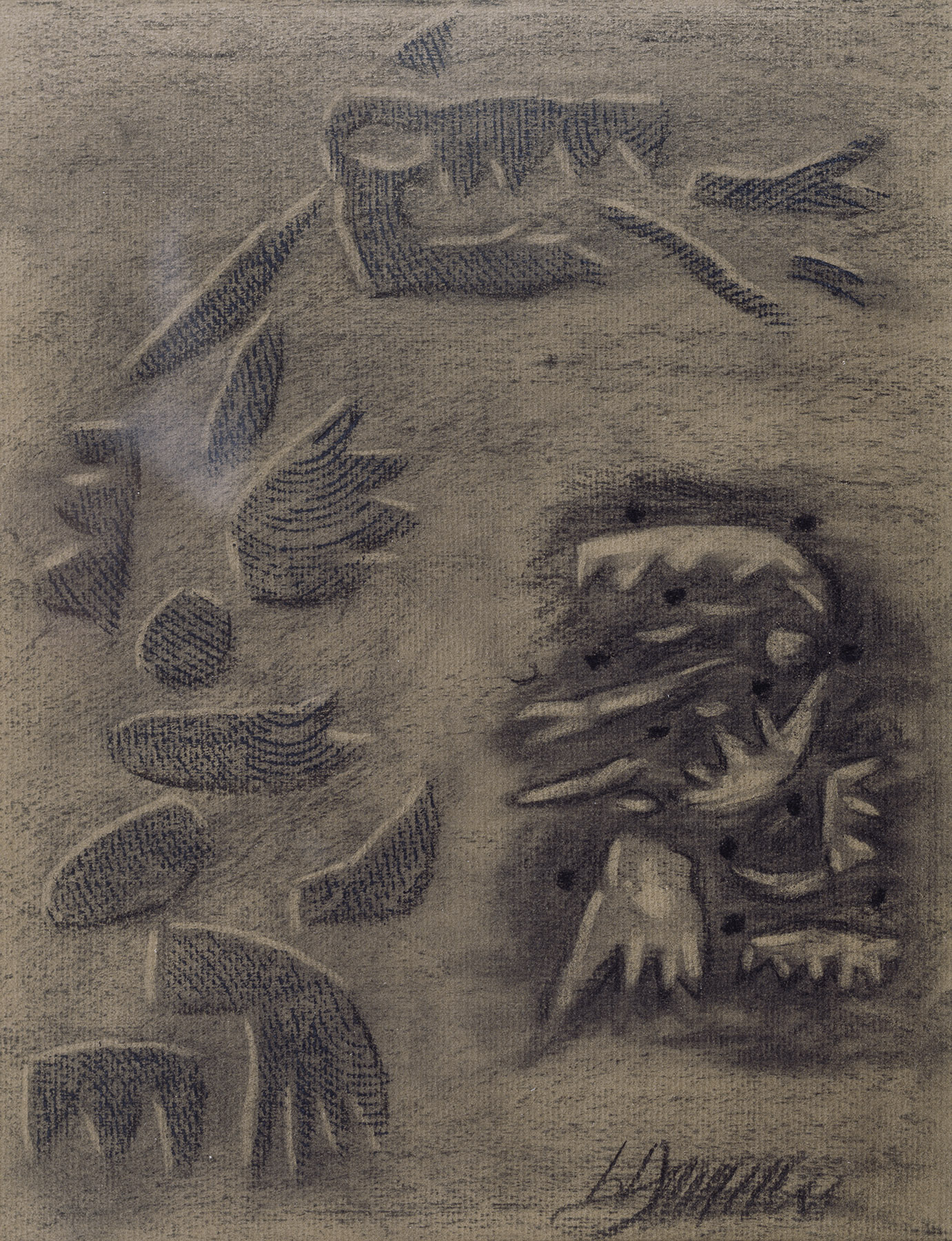 Kohle, gewischt, radiert, Kreide, auf Bütten