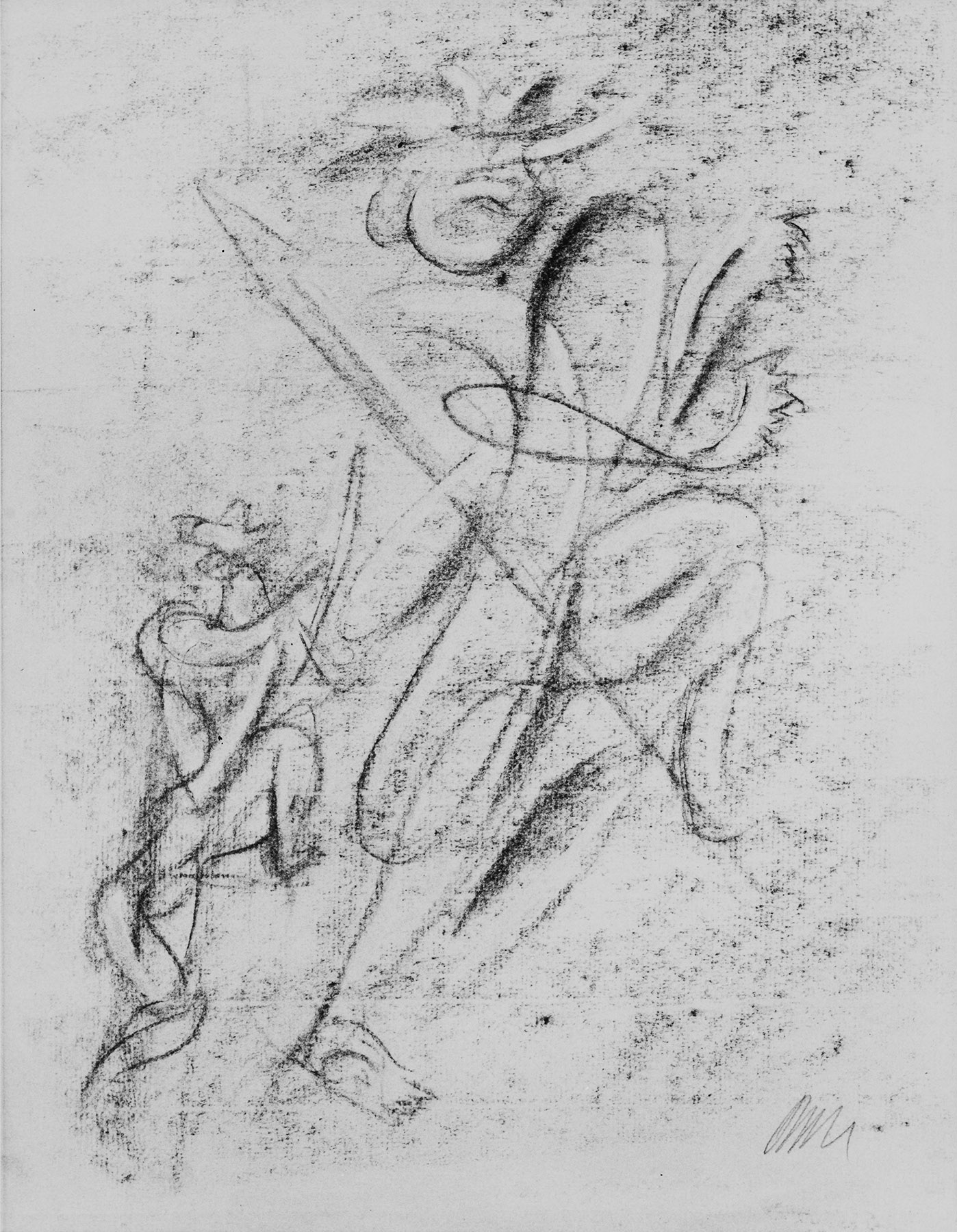Kohle, gewischt, radiert, fixiert, auf gelblichem Ingres-Bütten