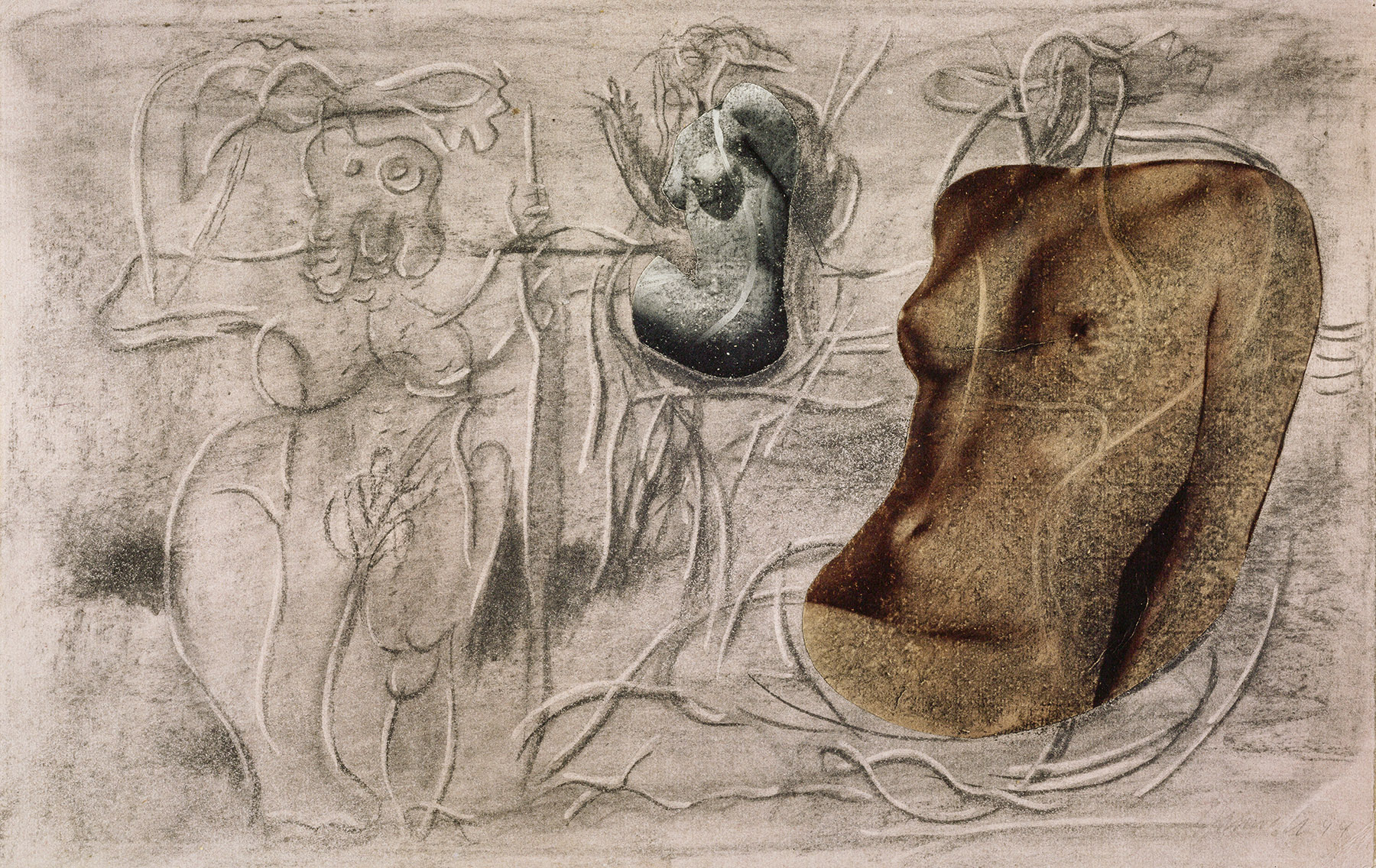 Kohle, gewischt, radiert, Collage mit zwei Fragmenten reproduzierter weiblicher Aktfotos (der kleinere grau, der große rosa-weiß), mit Kohle übergangen, fixiert, auf rosafarbigem Ingres-Bütten