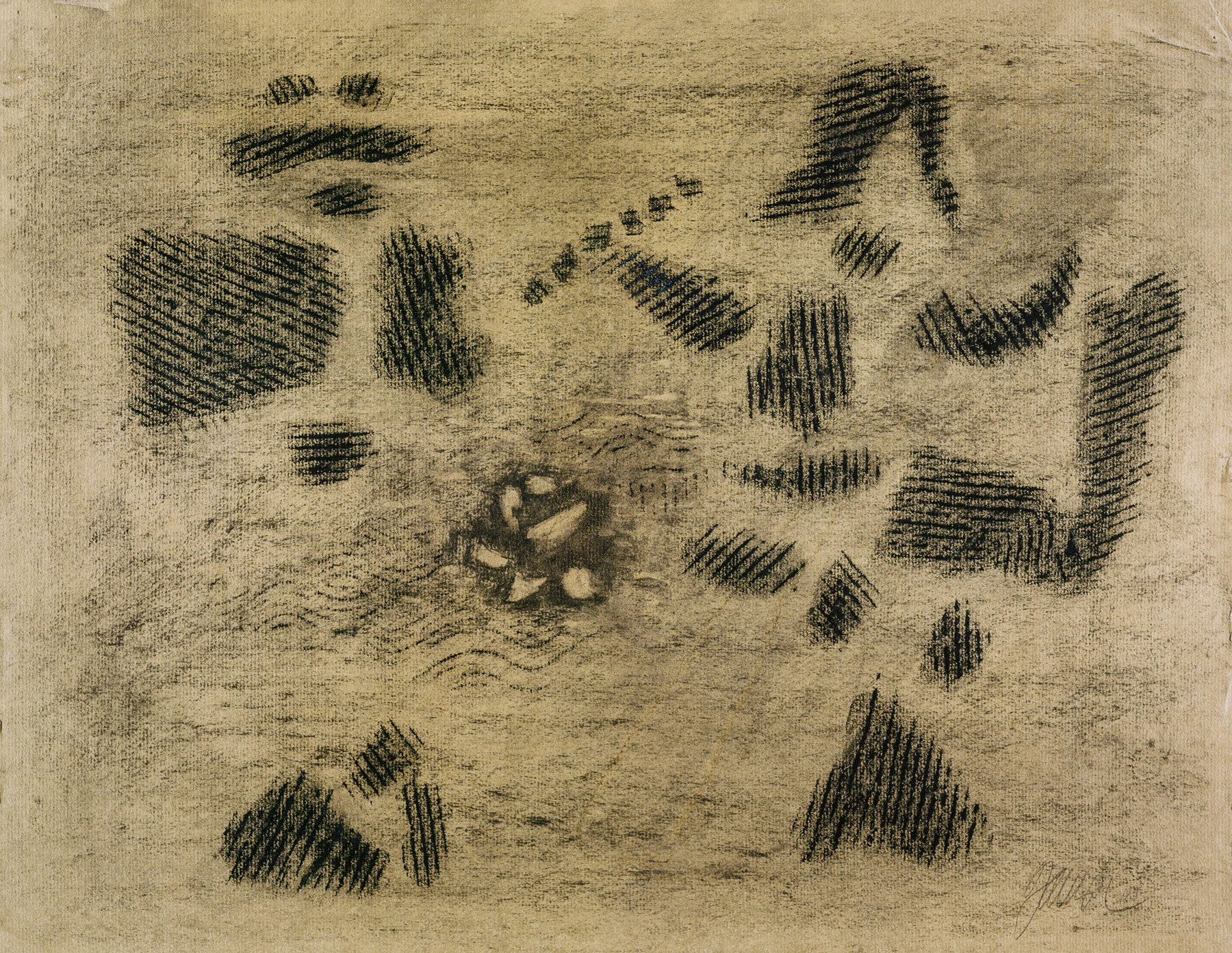 Kohle, gewischt, Ölkreide in Schwarz, durchgerieben, Braun (für eine ältere diagonale Form r., die wohl getilgt wurde), fixiert, auf mittelbraunem Ingres-Bütten mit Wz. r. u.: PMF(ITALIA)