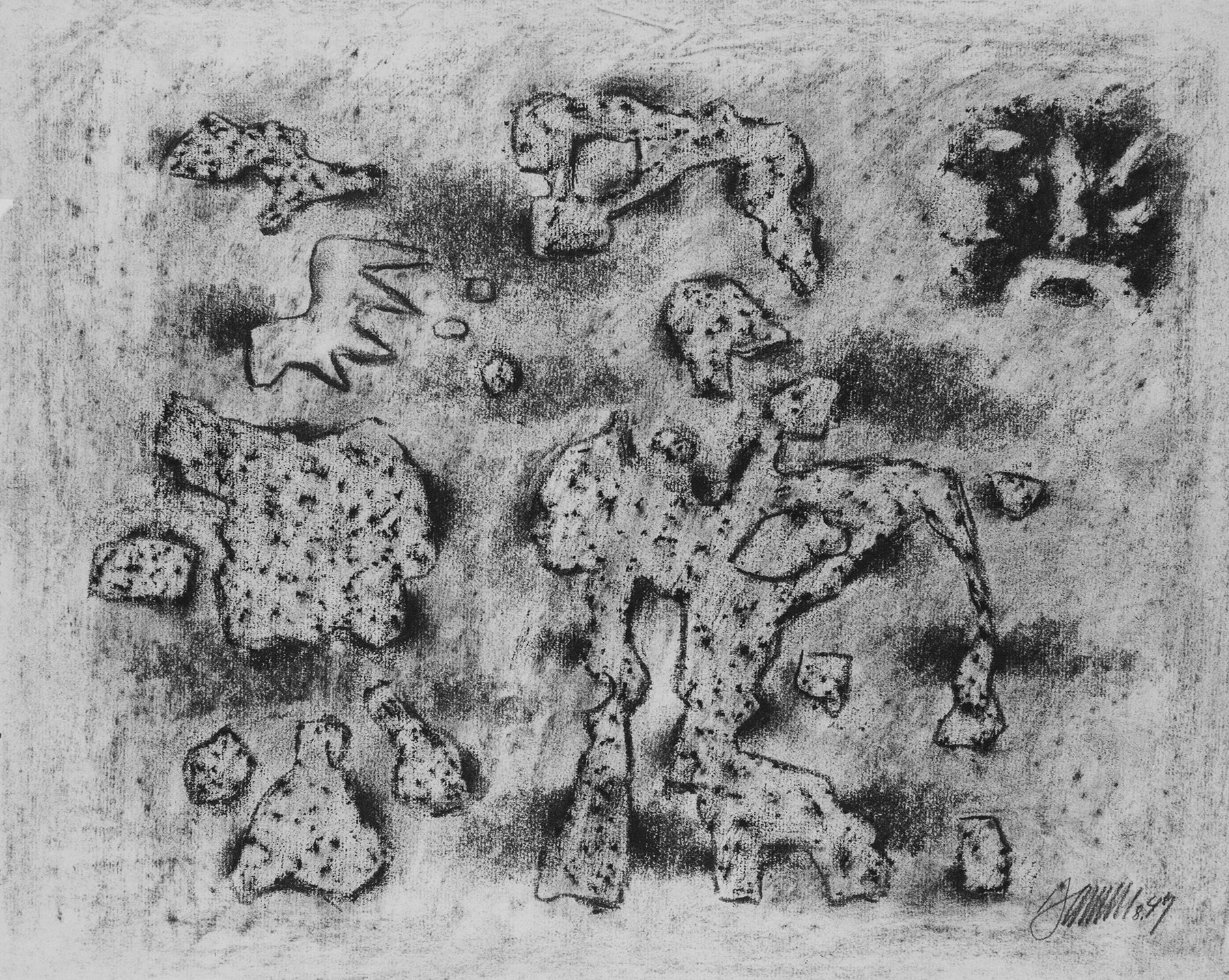 Kohle, gewischt, Ölkreide in Schwarz, fixiert, auf chamoisfarbigem bis lichtblauem Ingres-Bütten mit Wz. l. u.: ... N & MONTGOLFIER FRANCE und r. o.: Kartusche