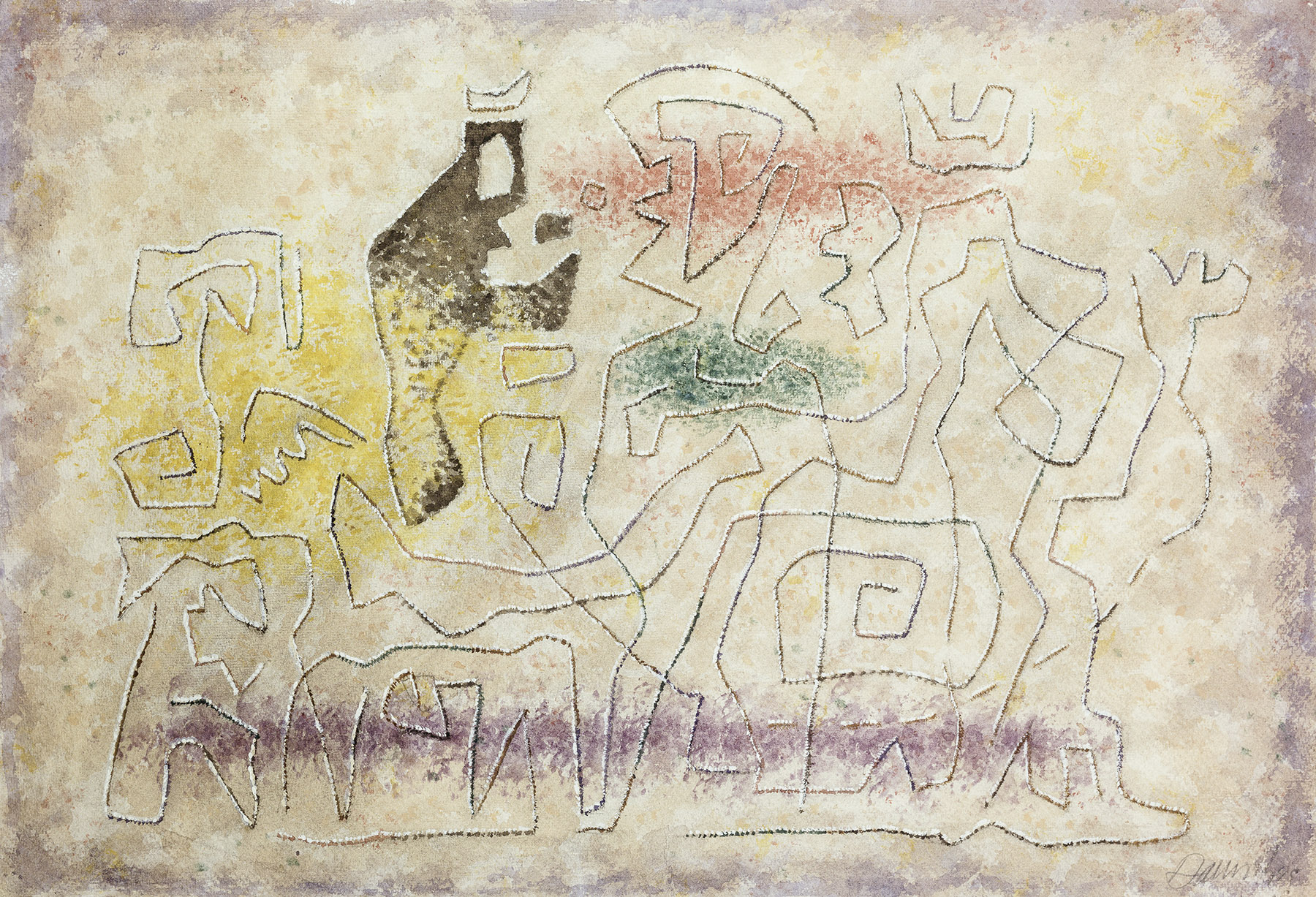 Aquarell in Rot, Grün, Violett, Blau, Gelb, Braun, Orange, Ocker, Deckweiß, Vorzeichnung in Kohle (mit Wischungen) und Bleistift (?), auf Aquarellpapier mit Leinenprägung