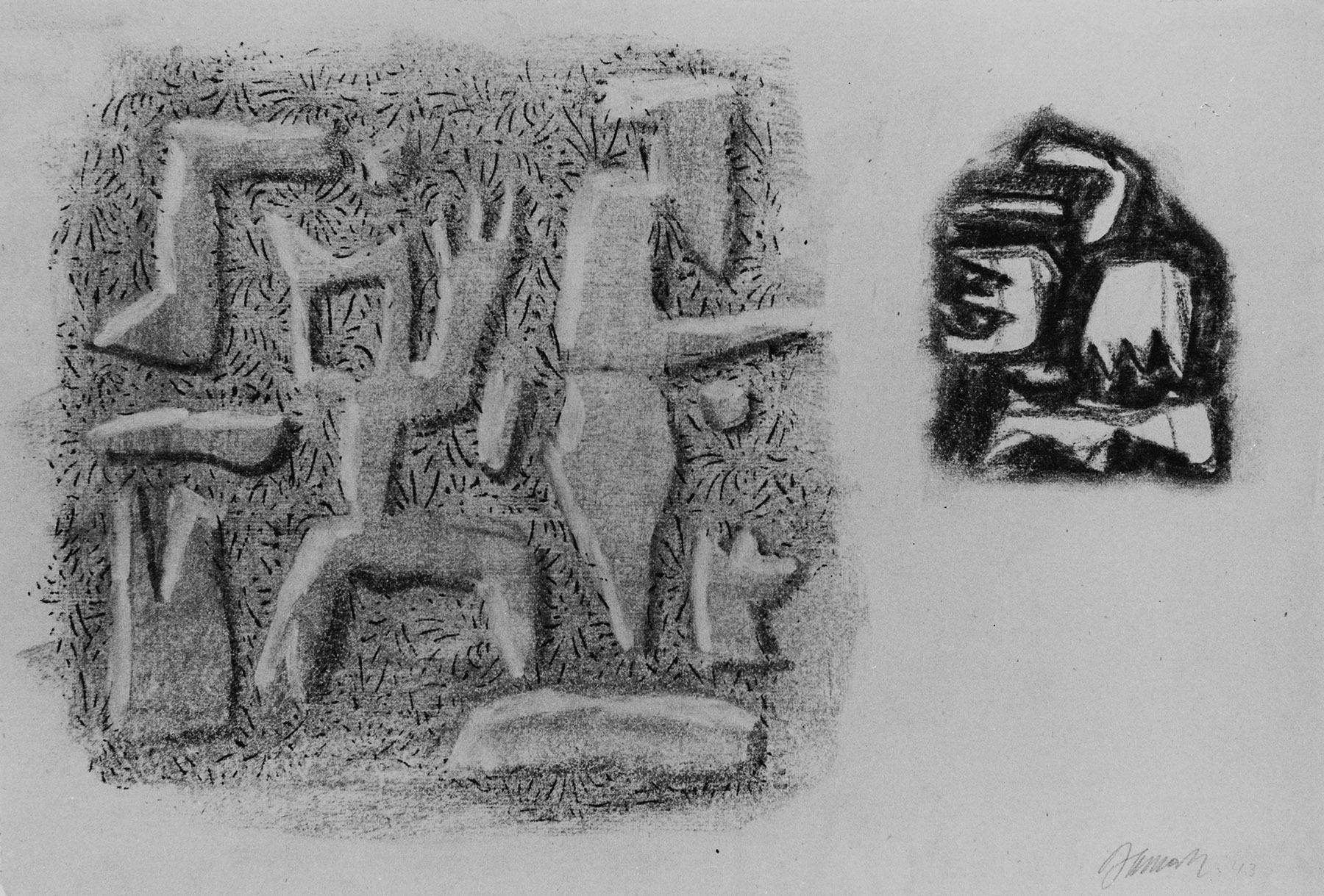 Kohle, gewischt, radiert, Ölkreide in Schwarz, durchgerieben, fixiert, auf gelblichem Ingres-Bütten mit Wz. l. u.: FS handgeschöpft