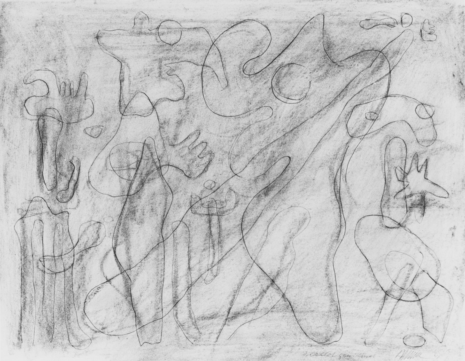 Kohle, Bleistift, Ritzkonturen (gepaust), fixiert, z. T. gelblich laviert, auf chamoisfarbigem, am Rand o. perforiertem Zeichenkarton