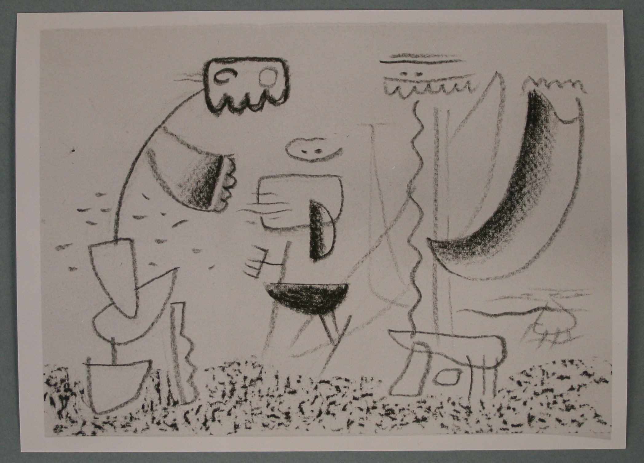 Ölkreide, z. T. durchgerieben, Vorzeichnung in Kohle, auf chamoisfarbigem bis beige-bräunlichem, am Rand o. gerissenem, holzhaltigem Konzeptpapier
