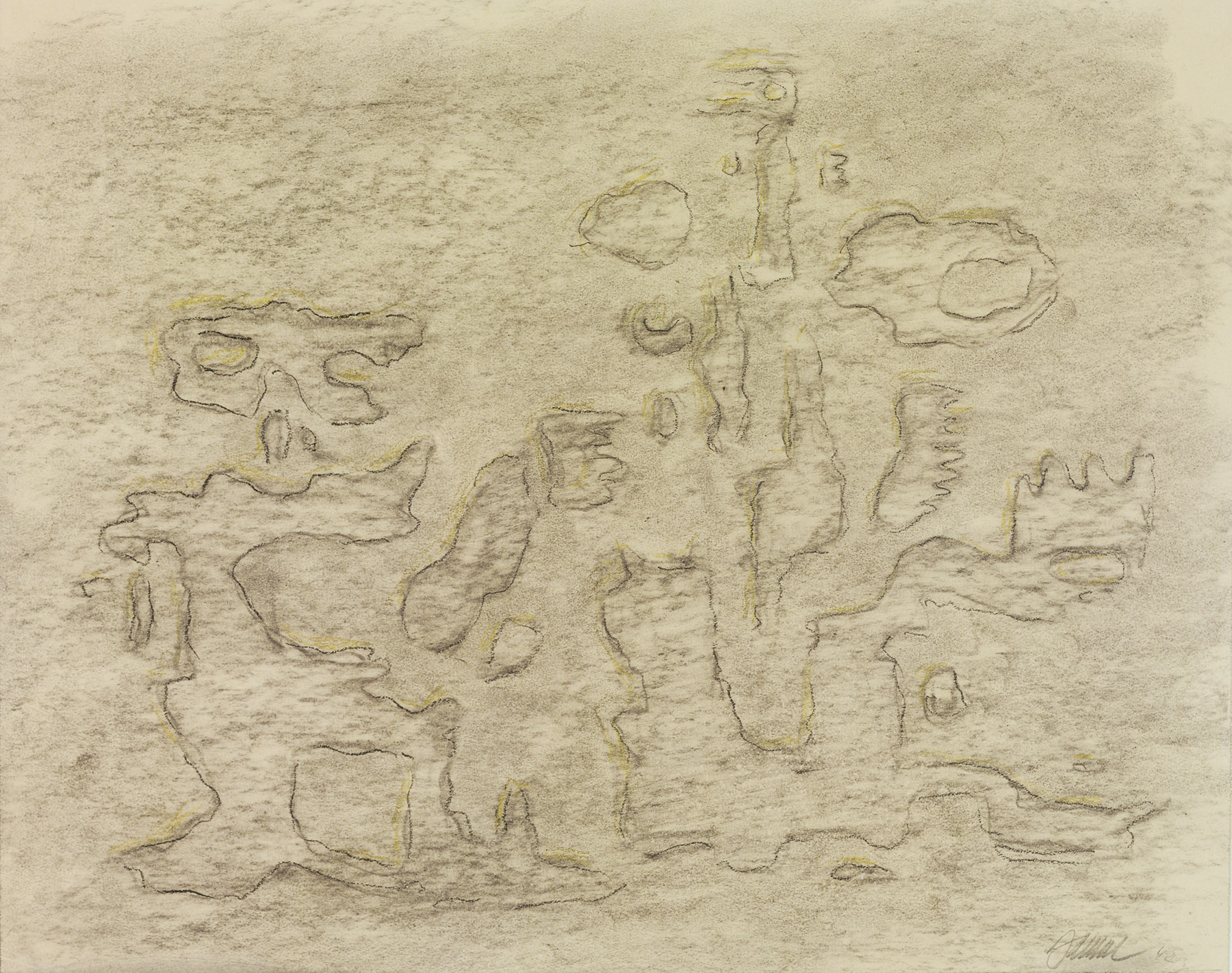 Kohle, gewischt, Ölkreide in Schwarz, Gelb, fixiert, Einfassungslinien in Bleistift, auf hellbeigefarbigem, am Rand l. leicht schrägem Zeichenkarton