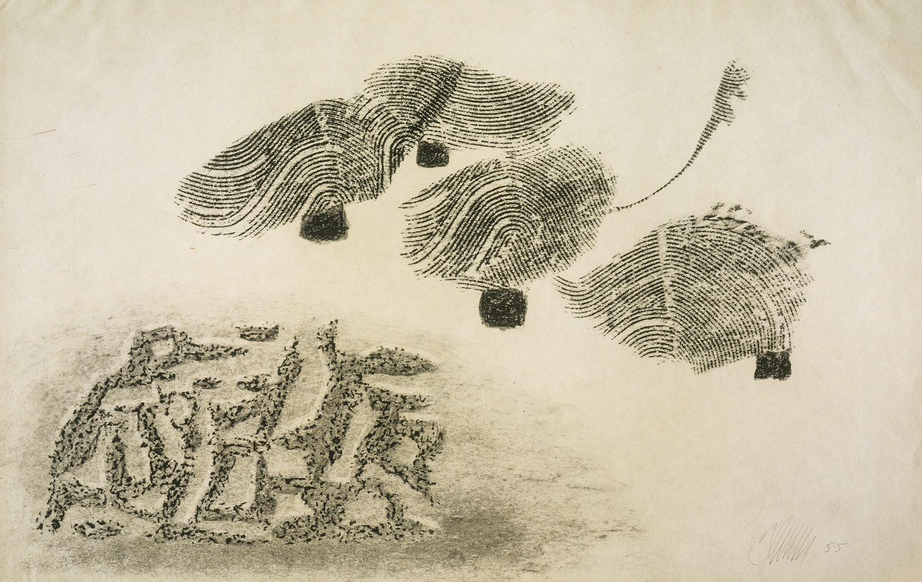 Kohle, gewischt, radiert, Ölkreide in Schwarz, durchgerieben, fixiert, auf chamoisfarbigem bis gelblichem, imitiertem Japanpapier