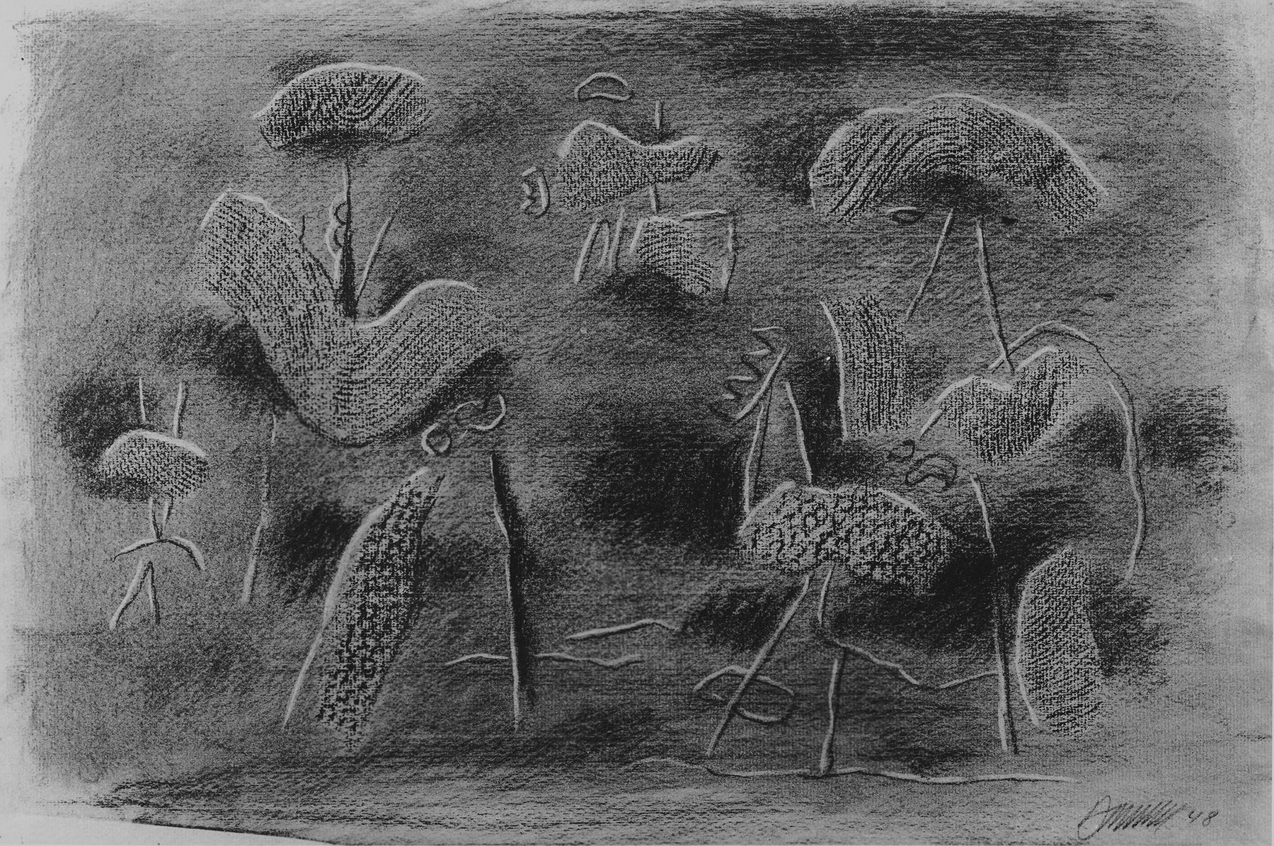 Kohle, gewischt, radiert, Ölkreide in Schwarz, durchgerieben, fixiert, auf rotbraunem Ingres-Bütten