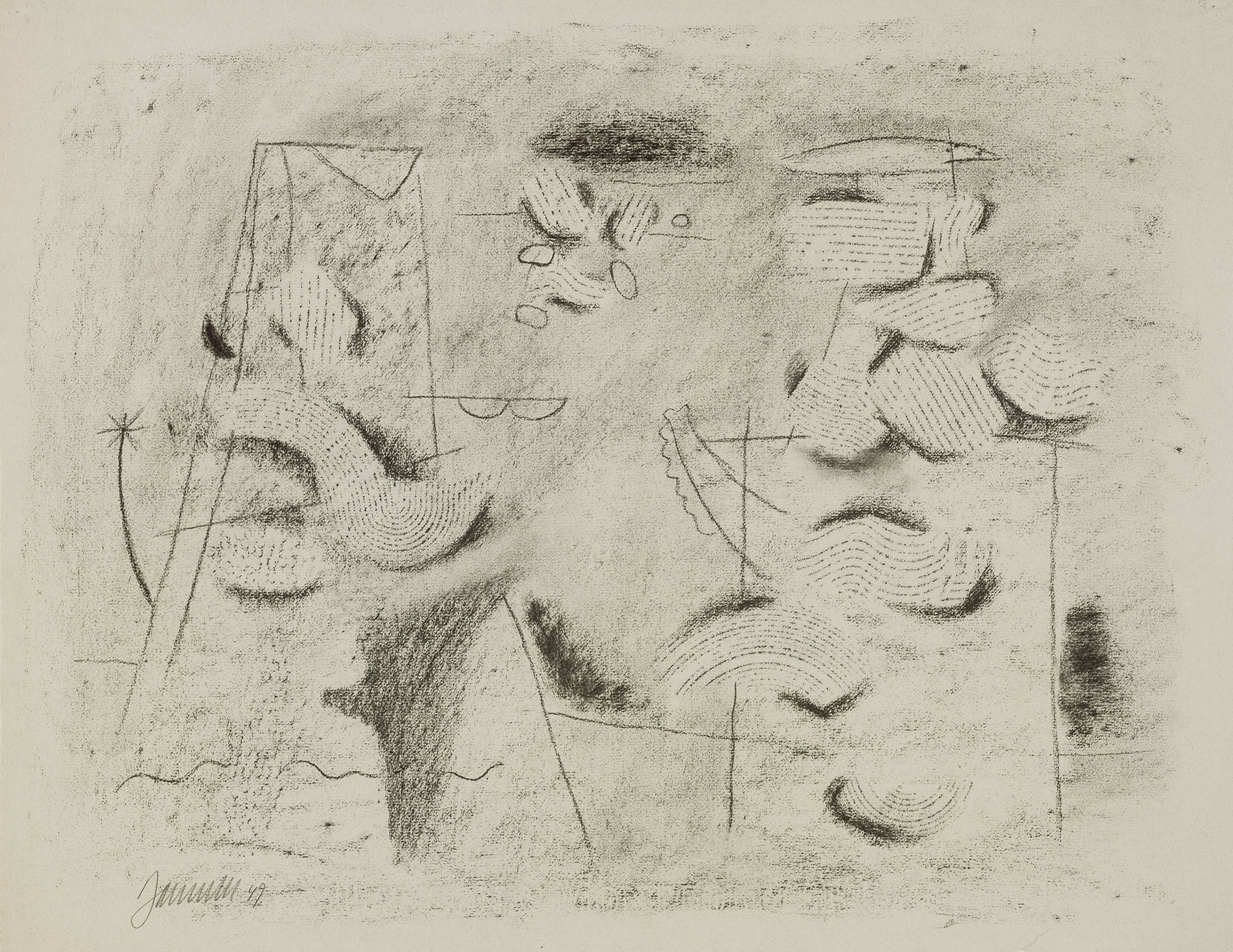 Kohle, z. T. gewischt, Ölkreide in Schwarz, durchgerieben, fixiert, auf chamoisfarbigem Ingres-Bütten mit hellblauen Fasern mit Wz. u. Mitte: CANSON & MONTGOLFIER FRANCE, l. o.: INGRES und r. o.: Kartusche