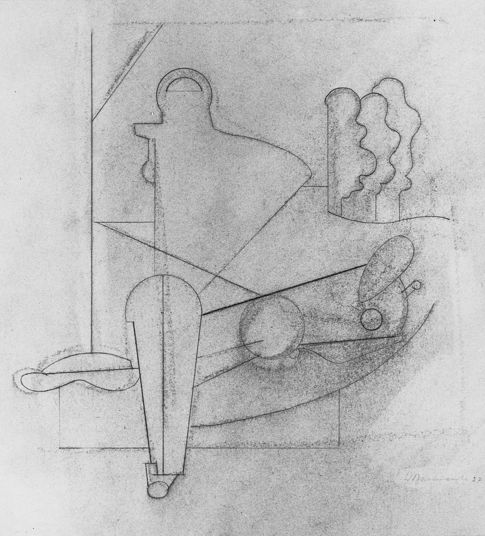 Bleistift, unter Verwendung von Zirkel und Lineal, Kohle, leicht gewischt, radiert, über Skizze in Kohle (mit Abweichungen), z. T. vorgeritzt mit hartem Bleistift, fixiert, Einfassungslinien, auf chamoisfarbigem Zeichenkarton