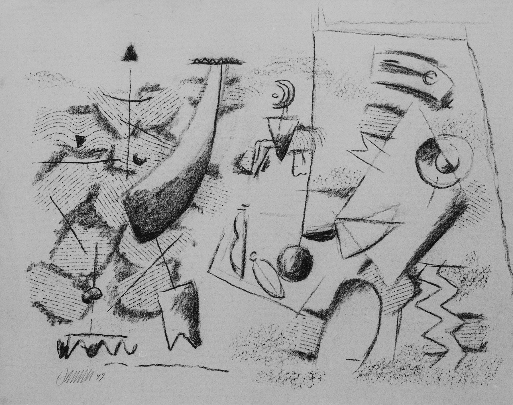 Vgl. das von B. „8.47“ datierte Gemälde G 1014. (fkb) 1897-1975: Umfangreiche Gruppe mit Kompositionen des „Kegelspiels“ und der Metaphysischen Landschaftern aus den Jahren 1947-49. Das „Kegelspiel“ ist eine der entscheidenden Bilderfindungen Baumeisters aus den Jahren 1944-45. Sie besteht aus malerischen, durch Linienfiguren im Landschaftlichen angesiedelten Motiven. Von 1947 an verhärten sich diese Figuren: Kantige und kompaktere Teile werden mit Linien verbunden. Das landschaftliche Element verstärkt sich; die Durchreibetechnik, wie sie vor allem in den Sonnenfiguren der Jahre 1947-49 vorkommt, wird auch hier eingesetzt. Die ersten Blätter Z 1897-1900 zeigen noch die Grundstruktur des Kegelspiels: zwei sich gegenüberstehende Figuren, in der Mitte die aufgehängte Kugel, unten die aufgestellten Kegel. Auf Z 1899 ist oben das augenförmige Motiv zu erkennen, welches späterhin für die Metaphysische Landschaft« charakteristisch wird.