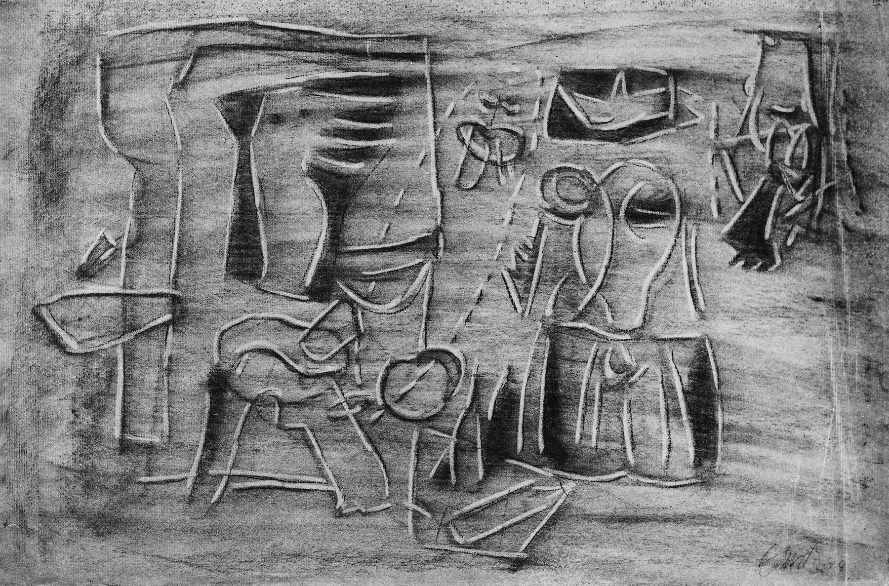 Kohle, gewischt, radiert, fixiert, auf braunem Ingres-Bütten