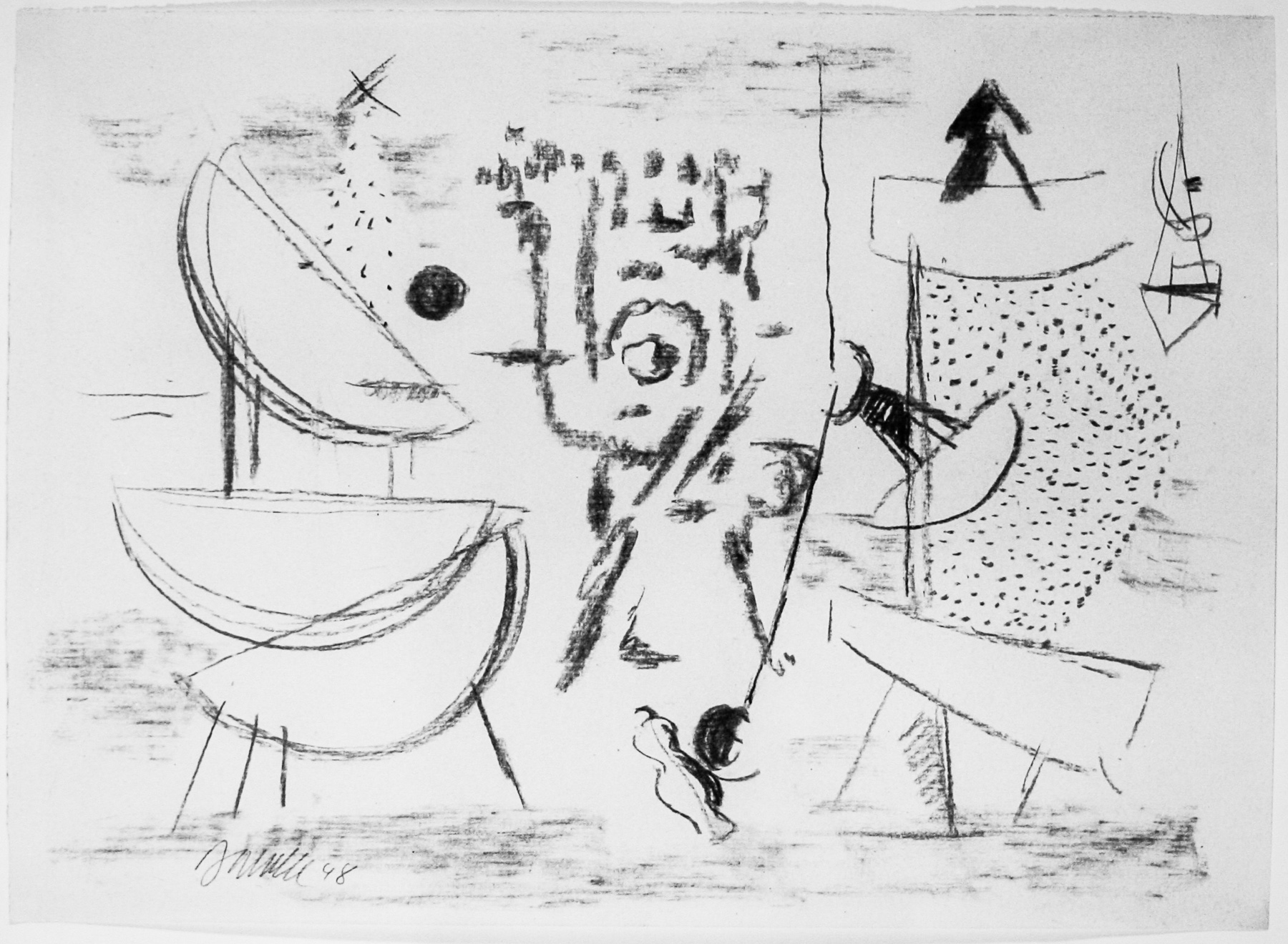 Vgl. das von B. „3 48“ datierte Gemälde G 1084. (fkb) 1901-1915: Die Blätter der zweiten „Kegelspiel“ - Gruppe stammen aus den Jahren 1948, 1949 und zeigen - wiederum dialogisch aufgebaut - die beiden spielenden Figuren. In der Mitte taucht aus der Tiefe das Fragment eines Riesen auf, das an die Illustrationen erinnert. Auf den Blättern des Jahres 1949 werden bevorzugt farbige Pastellkreiden eingesetzt, Linien durch Radieren in sensibler Modulation erzeugt.