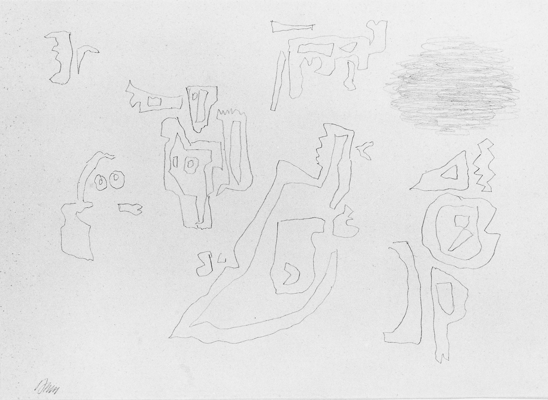 Vgl. das von B. „12 53“ datierte Gemälde G 1356. - Die schwertähnliche Hauptform erscheint als schwarze Form in den Gemälden G 1421 von 1953 und G 1422 von 1954, seitenverkehrt. (fkb)