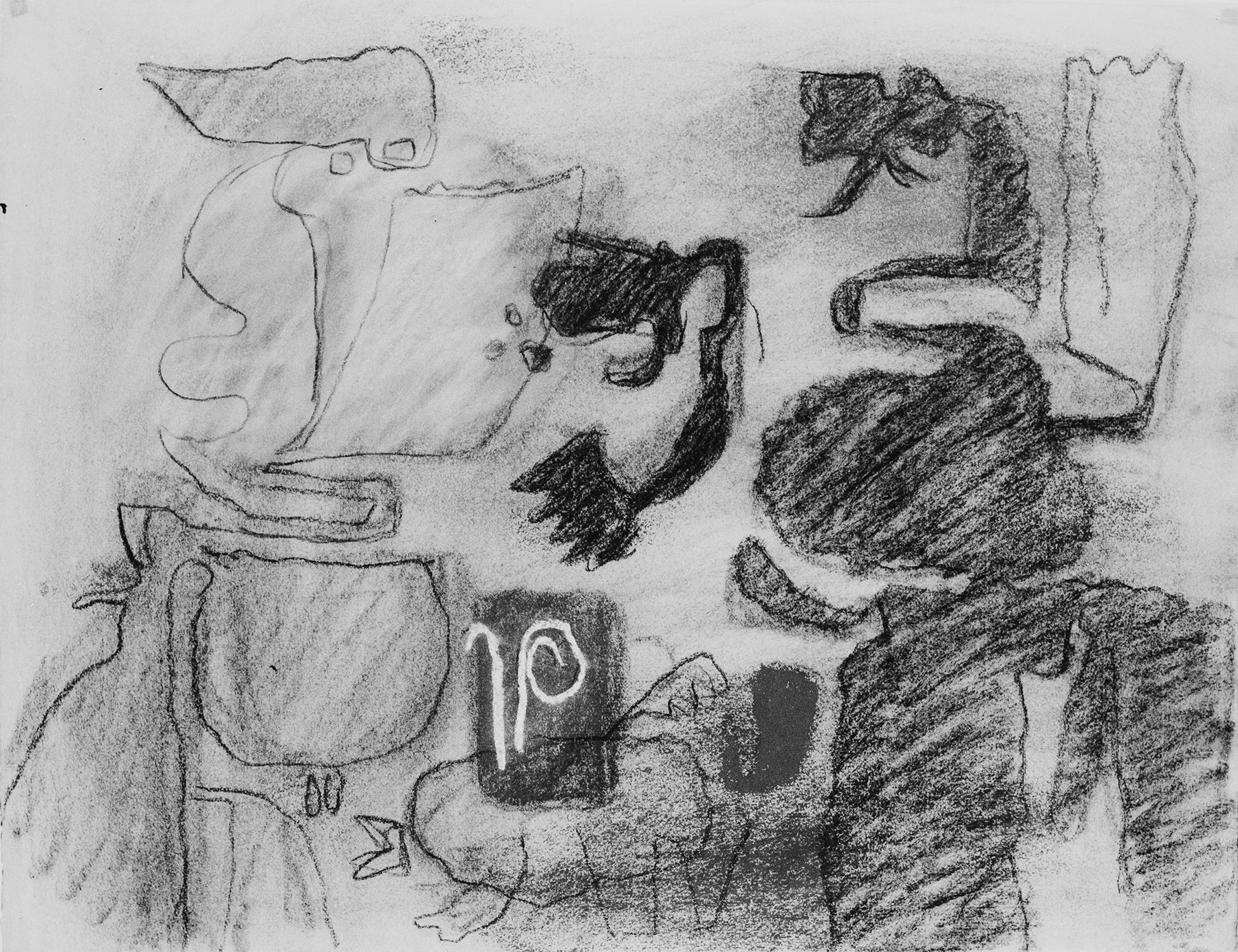 Kohle, gewischt, Pastell in Rot, Gelb, Blau, Ocker, fixiert, auf chamoisfarbigem Ingres-Bütten