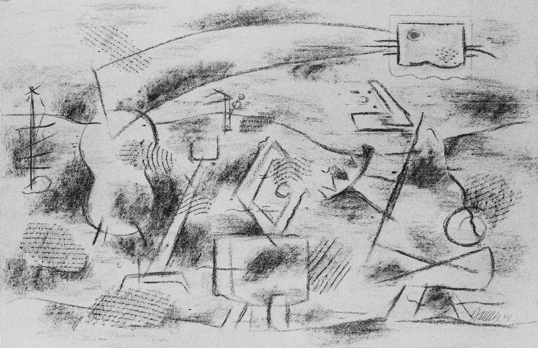 Kohle, z. T. gewischt, Ölkreide in Schwarz, durchgerieben, Pastell in Gelb, Blau, Grün, Orange, Rot, fixiert, auf hellblauem Ingres-Bütten mit Wz. l. o.: Hahn im Kreis