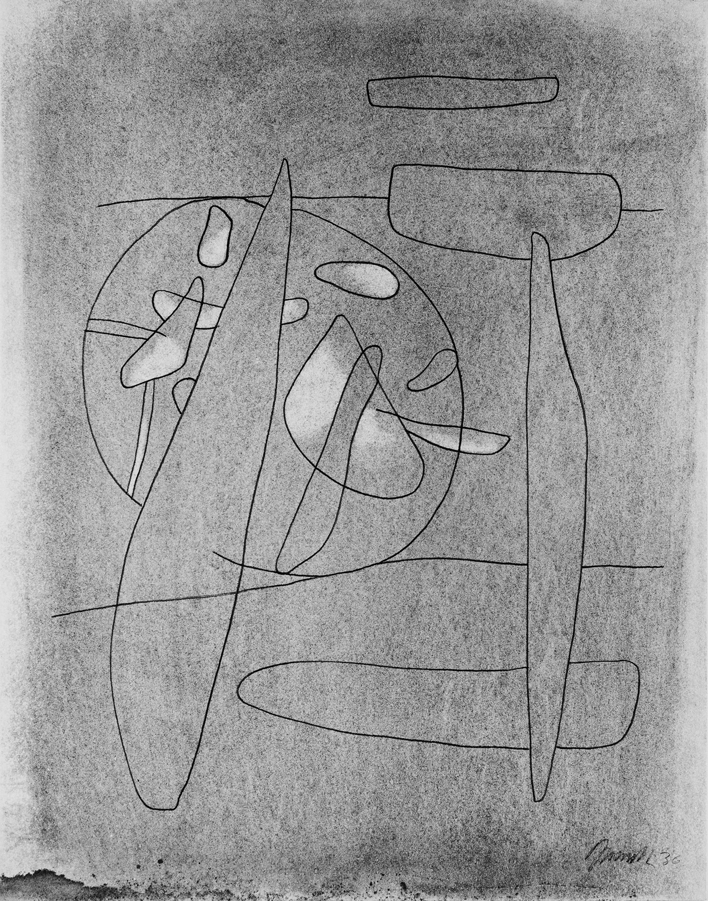 Kohle, gewischt, Bleistift, fixiert, Konturen vorgeritzt (fast ohne Abweichungen), auf chamoisfarbigem, am Rand l. perforiertem Zeichenkarton