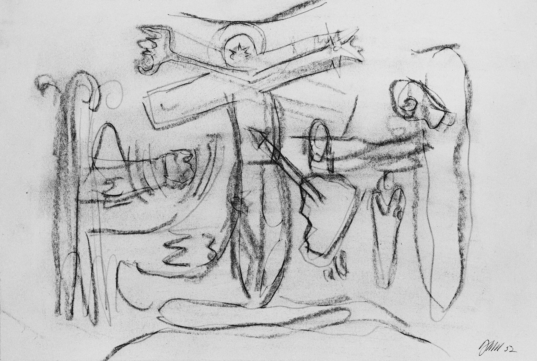 Kohle, z. T. gewischt, Bleistift, Ritzkonturen (z. T. gepaust?), fixiert, auf chamoisfarbigem Reproduktionskarton