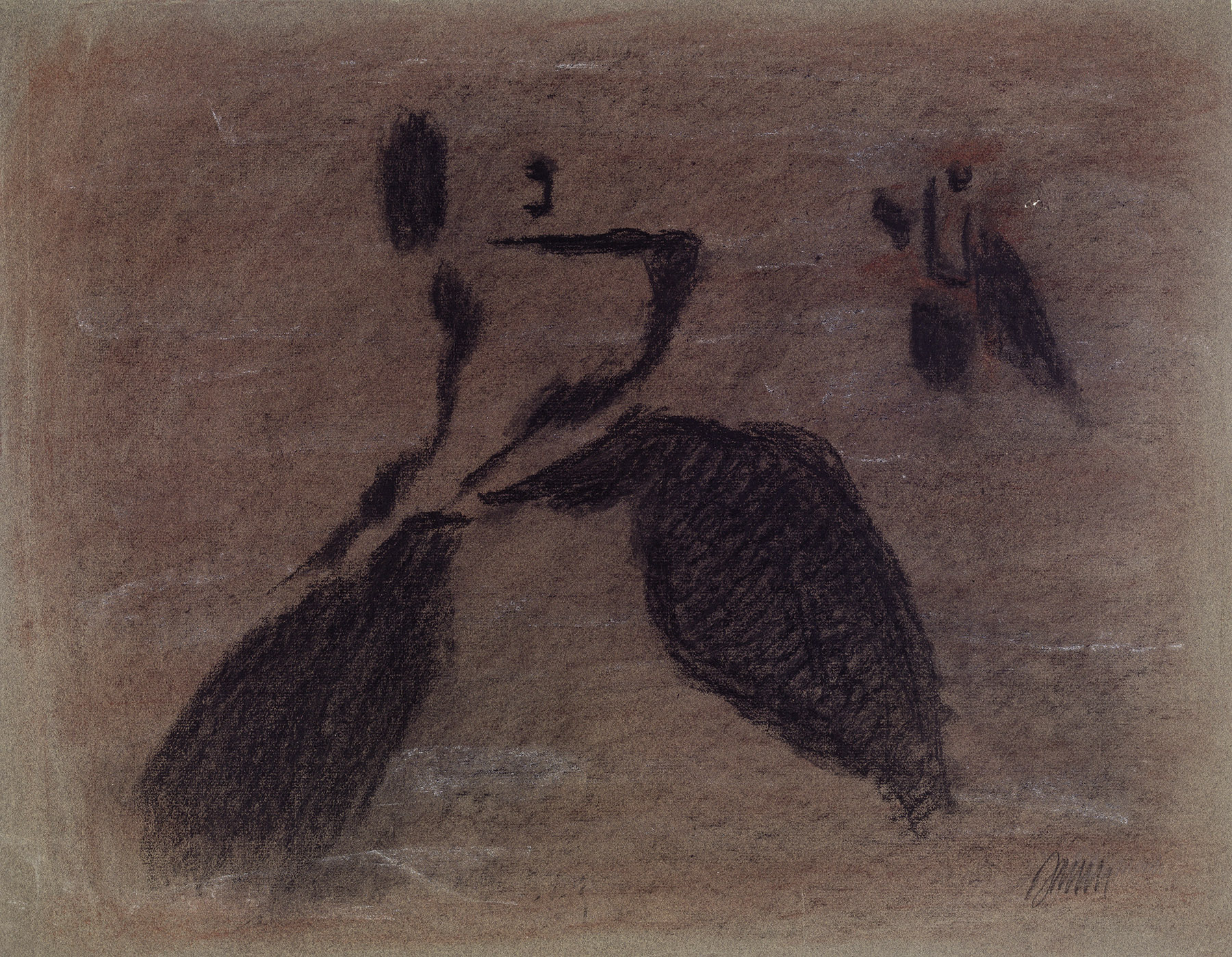 Kohle, gewischt, Ölkreide in Schwarz, Pastell in Rotbraun und Weiß, z. T. gewischt, fixiert, auf grünem Ingres-Bütten mit Wz. o.: CANSON & MONTGOLFIER FRANCE, l. u.: INGRES, r. u.: Kartusche
