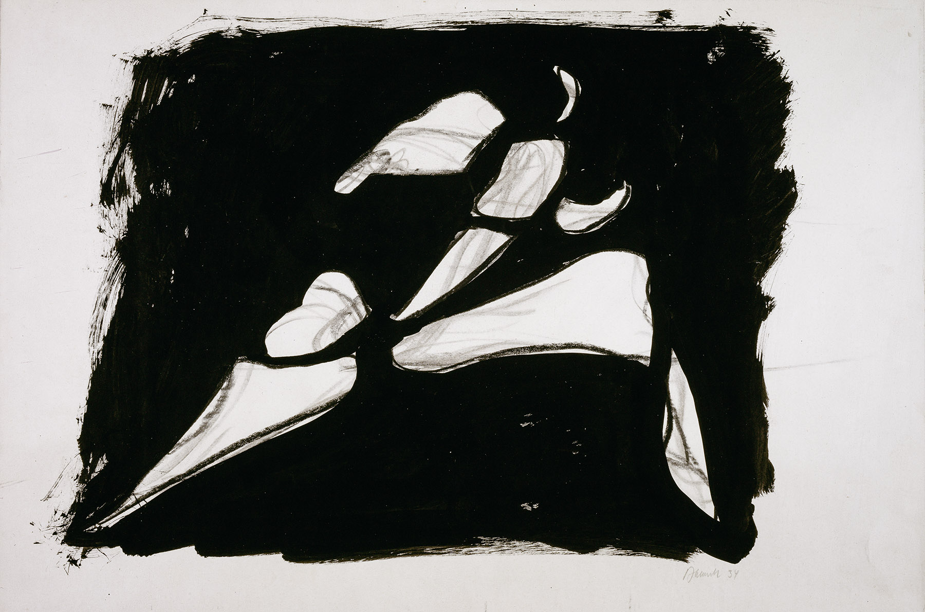 Kohle, Ölkreide in Schwarz, Ausziehtusche mit Pinsel, auf chamoisfarbigem, dickerem Zeichenkarton