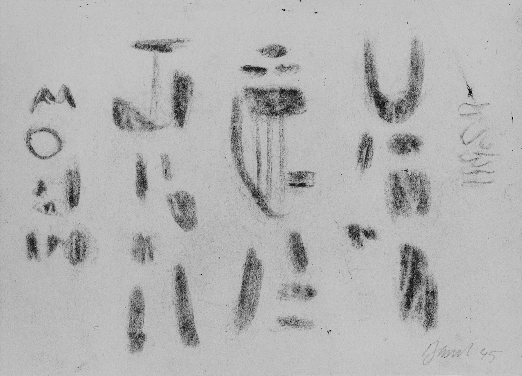 Kohle, starke blinde Ritzkonturen (mit starken Abweichungen), auf chamois- bis beigefarbigem, holzhaltigem, am Rand u. unregelmäßig gerissenem Papier (Konzeptpapier), verso geschwärzt mit Lithokreide