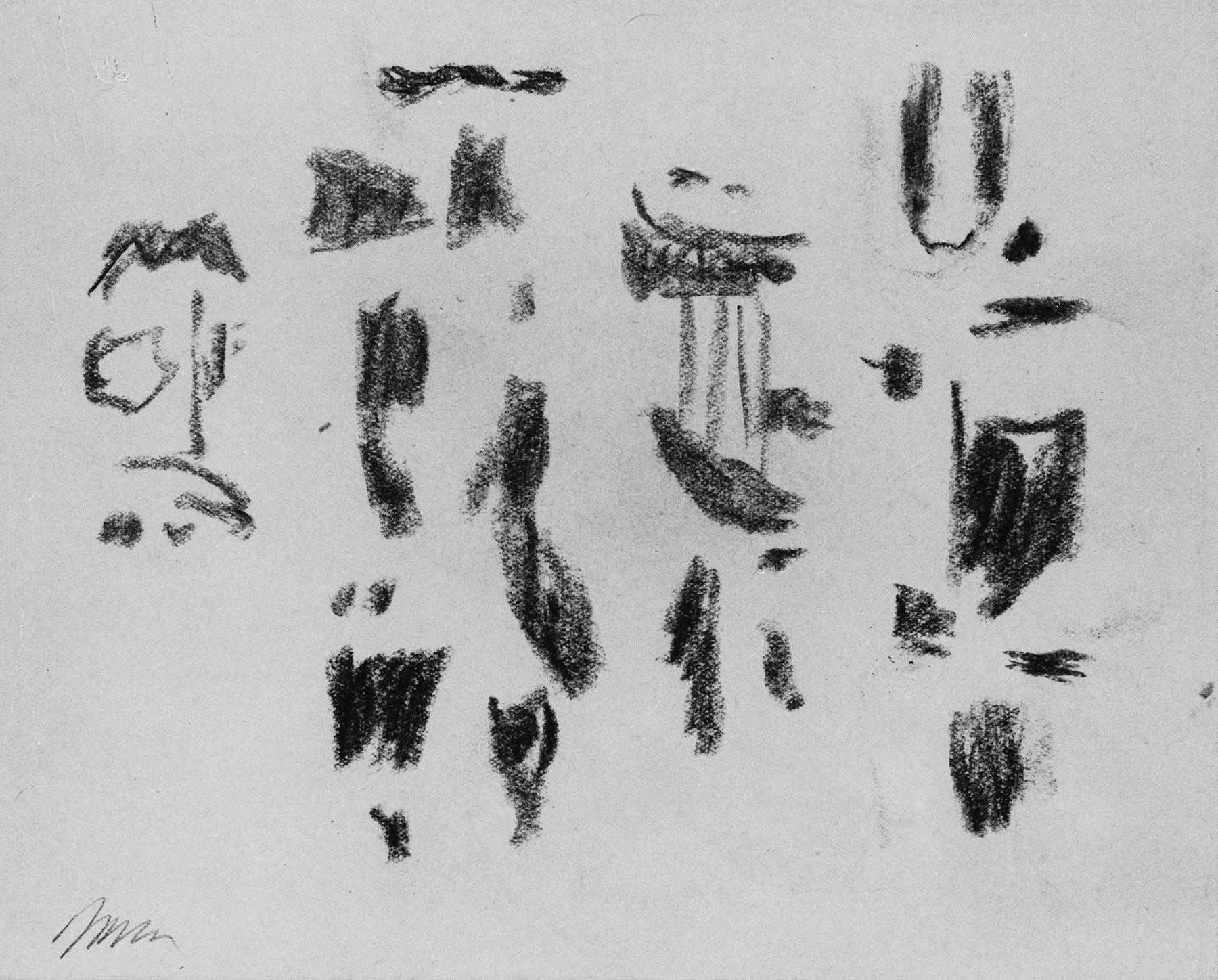 Kohle, auf chamoisfarbigem, am Rand o. und r. leicht fransend gerissenem Kupferdruckpapier
