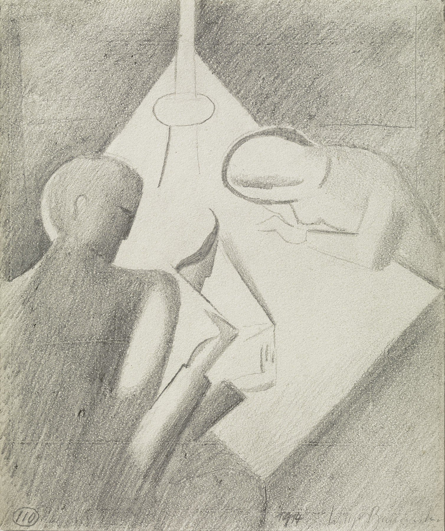 Dieses Blatt zeigt die Komposition des Ölbildes G 88. Es ist offenbar von B. sehr geschätzt worden, wie die ausführliche Signierung und die übergangene Datierung zeigen. Überdies wurde es in die Reihe der von B. durchnumerierten Blätter aufgenommen. Im Zeichenstil der Bleistiftschraffuren mit den weichen Übergängen wie in der imaginären Räumlichkeit ist noch immer die Nähe zu Meyer-Amden spürbar, während die Figuren auf der linken Seite mit den geschlossenen, plastischen Umrissen bereits eine Weiterformulierung ähnlich wie bei Schlemmer erkennen lassen.
