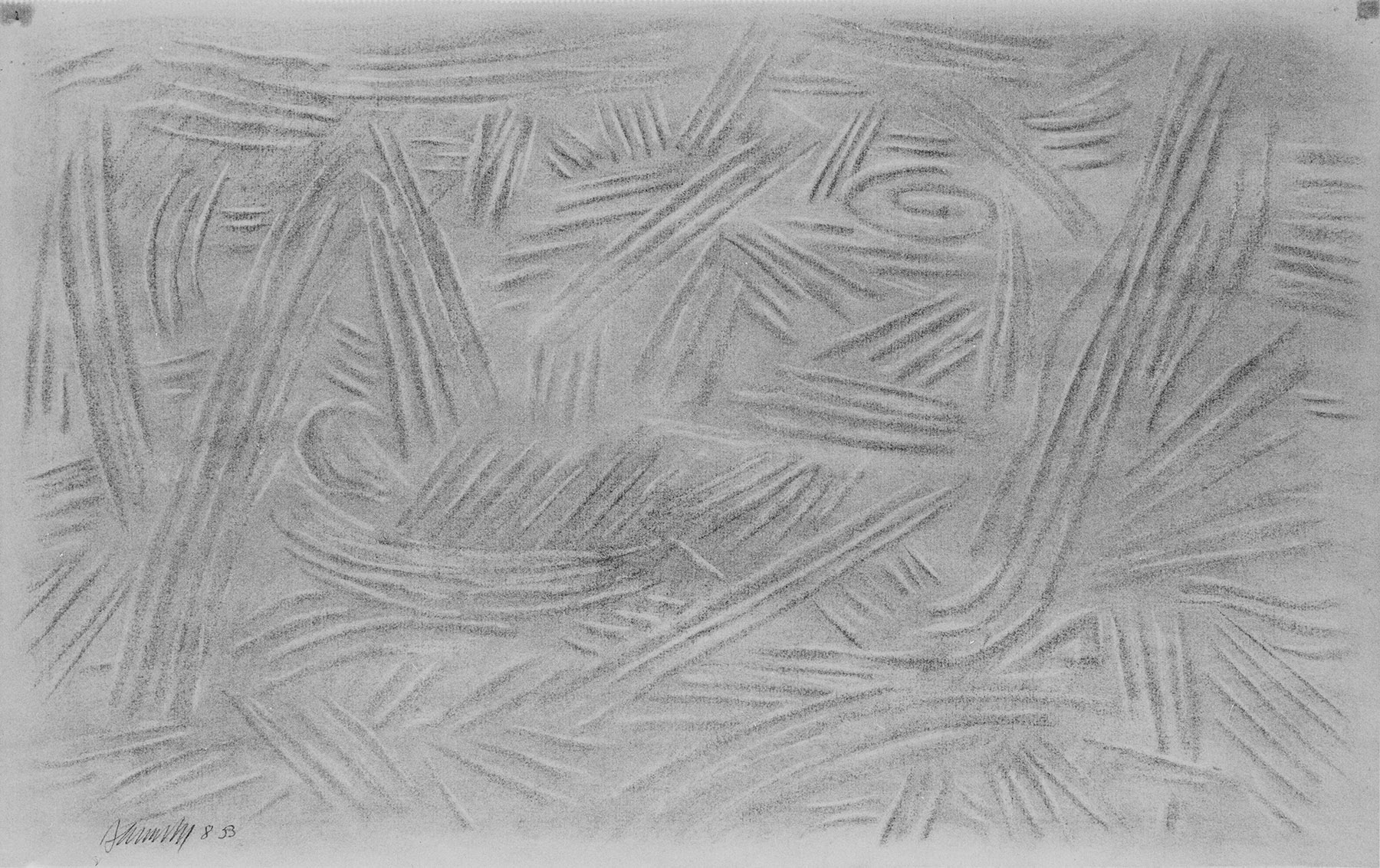 Kohle, Pastell in Grün, Blau, Gelb, Rot, Orange, gewischt, radiert, fixiert, auf beigefarbigem, am Rand o. perforiertem Ingres-Bütten