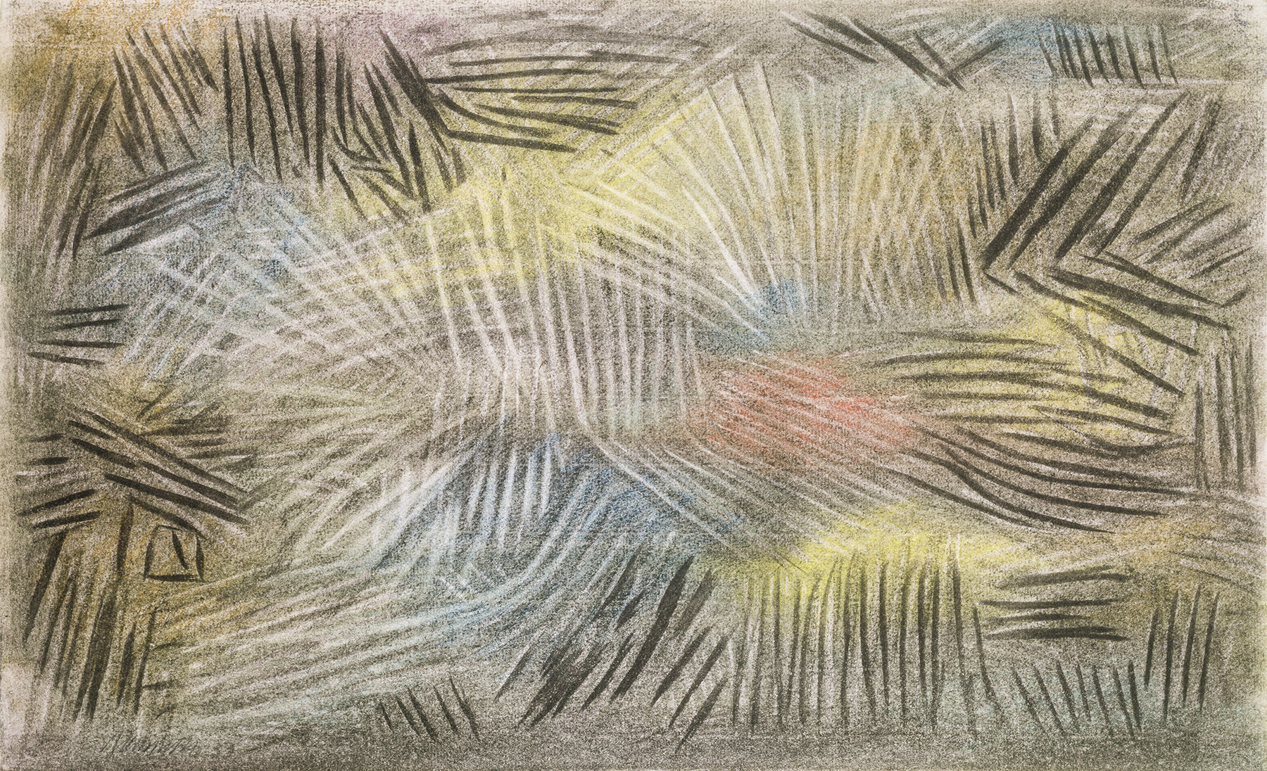 Kohle, gewischt, Pastell in Rot, Gelb, Blau, Braun, Pastell in Schwarz, in Wasser gelöst mit Pinsel aufgetragen, radiert, fixiert, auf rosafarbigem, am Rand o. perforiertem Ingres-Bütten