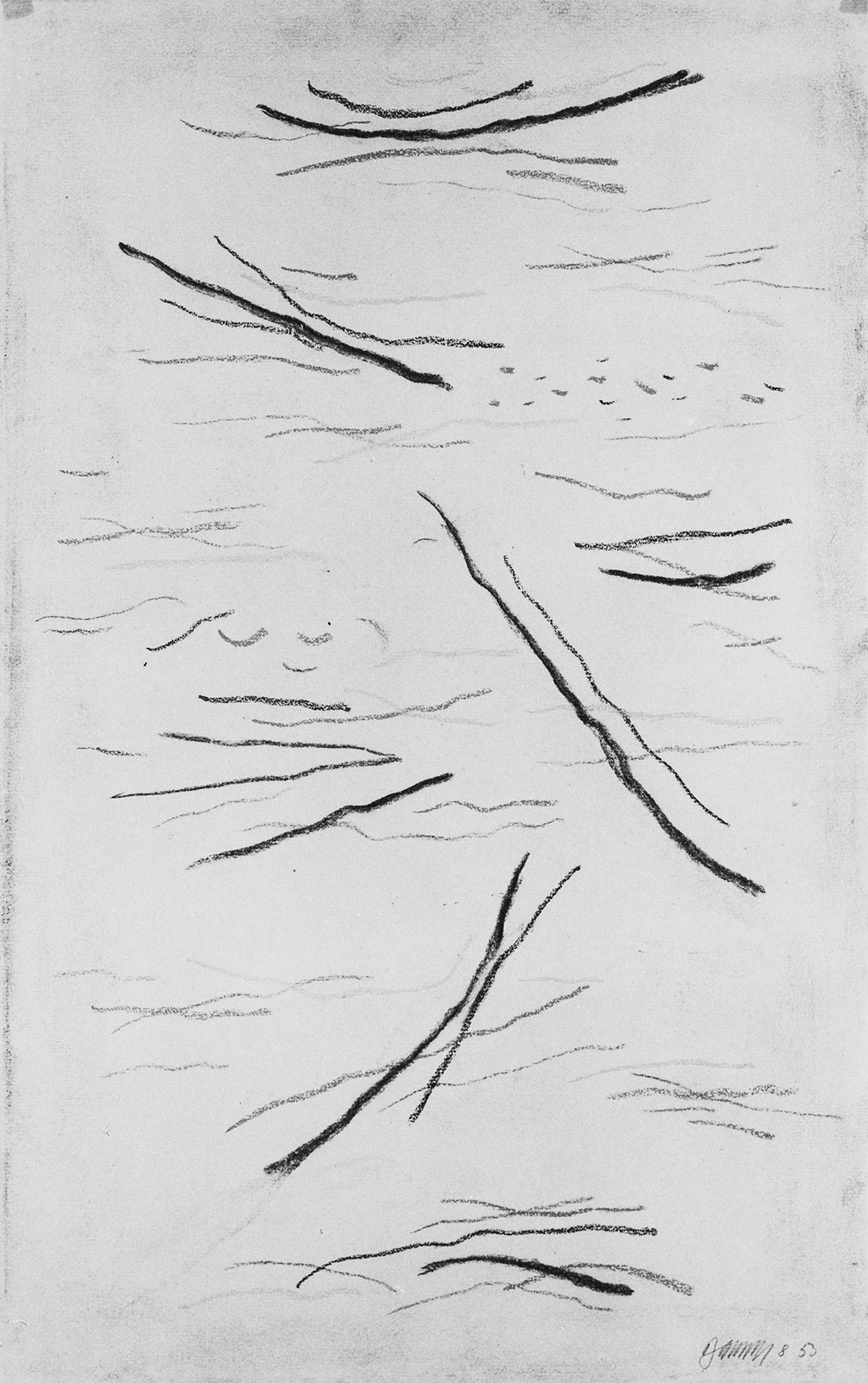 Kohle, z. T. gewischt, Pastell in Blau, Braun, Ocker, fixiert, auf chamoisfarbigem, am Rand l. perforiertem Ingres-Bütten