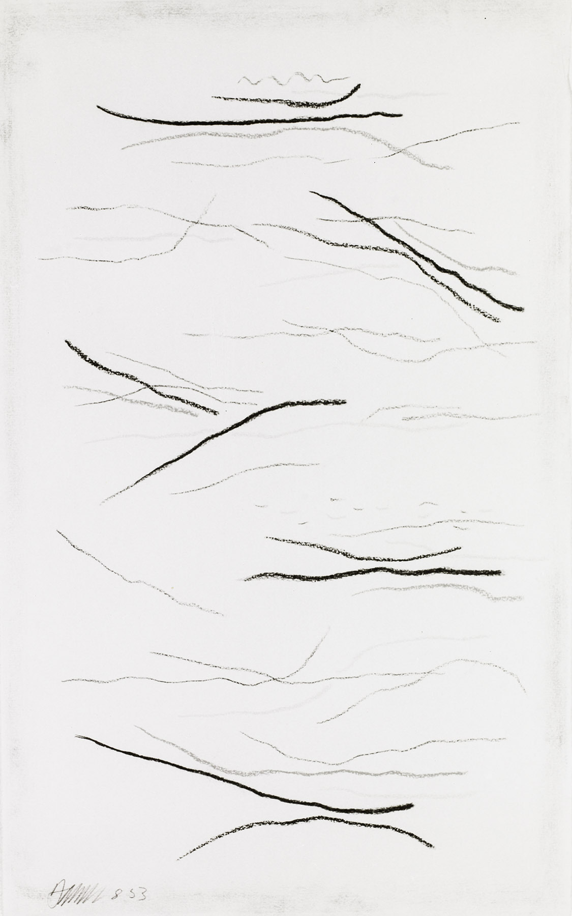 Kohle, z. T. gewischt, Pastell in Hellblau, Ocker, Rotbraun, fixiert, auf maisgelbem, am Rand l. perforiertem Ingres-Bütten