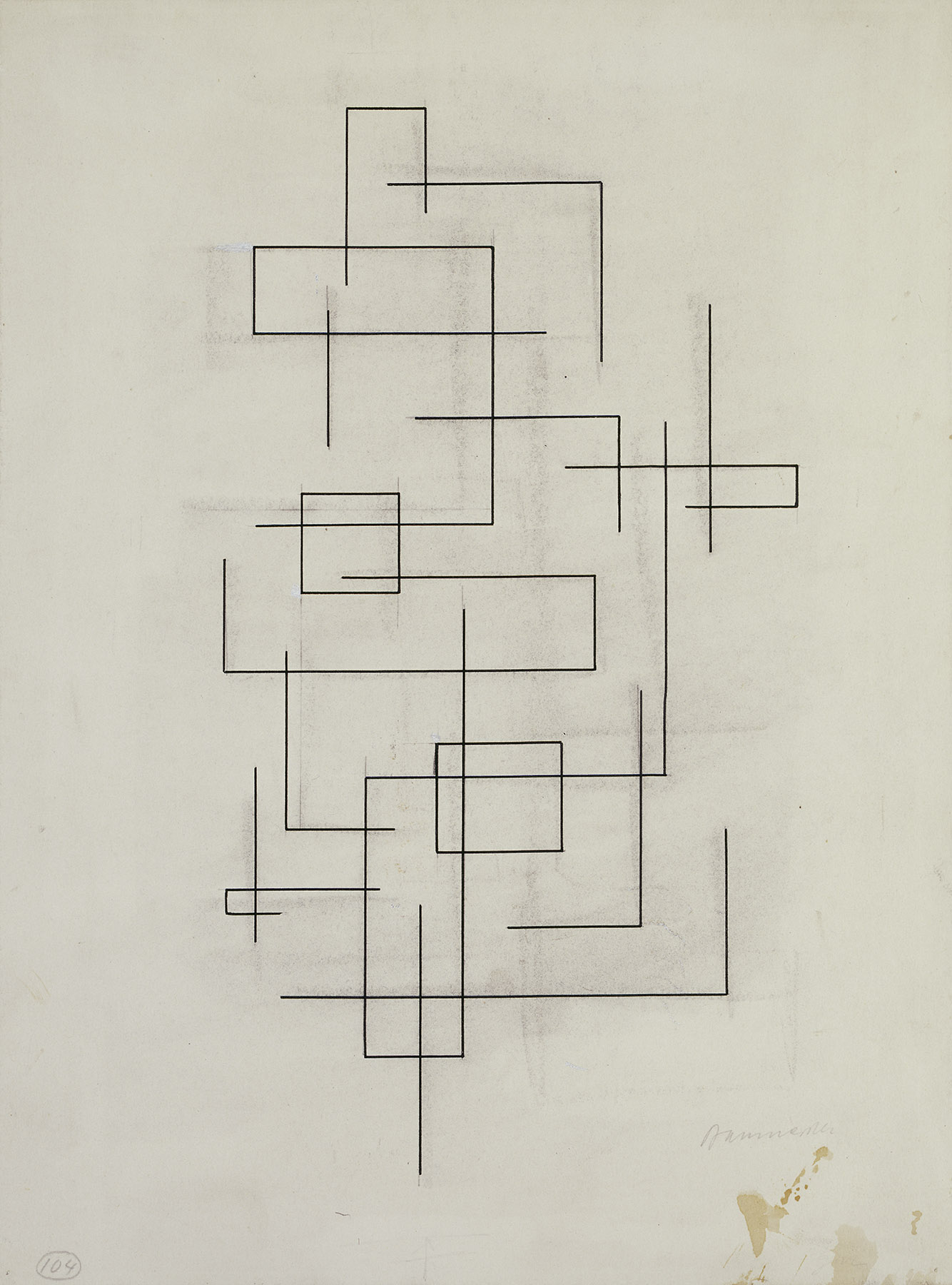 Kohle, gewischt, fixiert, Bleistift, unter Verwendung des Lineals, Feder in Ausziehtusche, Deckweiß zur Korrektur, auf chamoisfarbigem Zeichenkarton, auf stärkeren Karton aufgelegt, Markierungen für Passepartoutränder o. und u. radiert