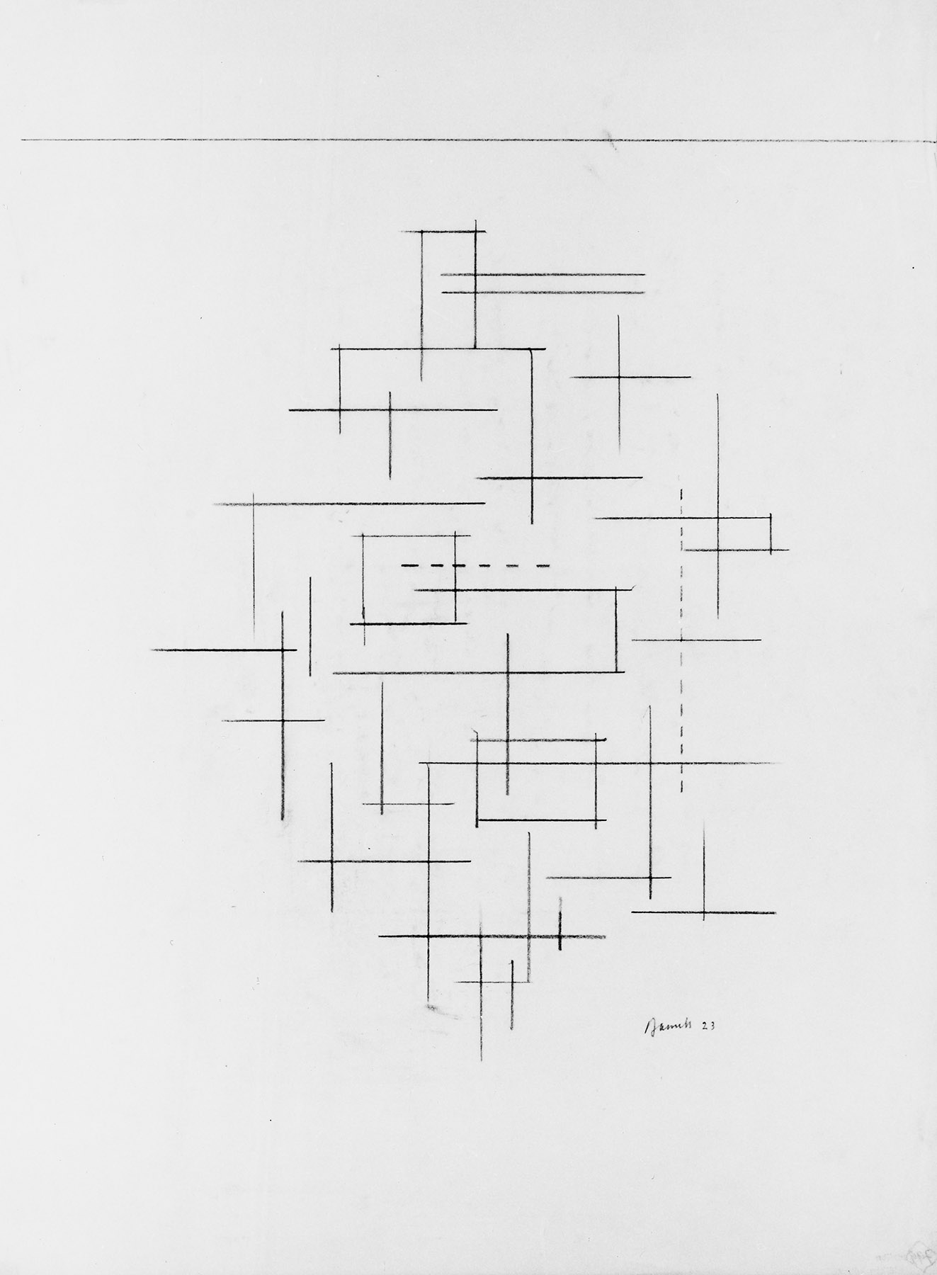 Bleistift, unter Verwendung des Lineals, oben Einfassungslinie, auf chamoisfarbigem, am l. Rand perforiertem Transparentpapier