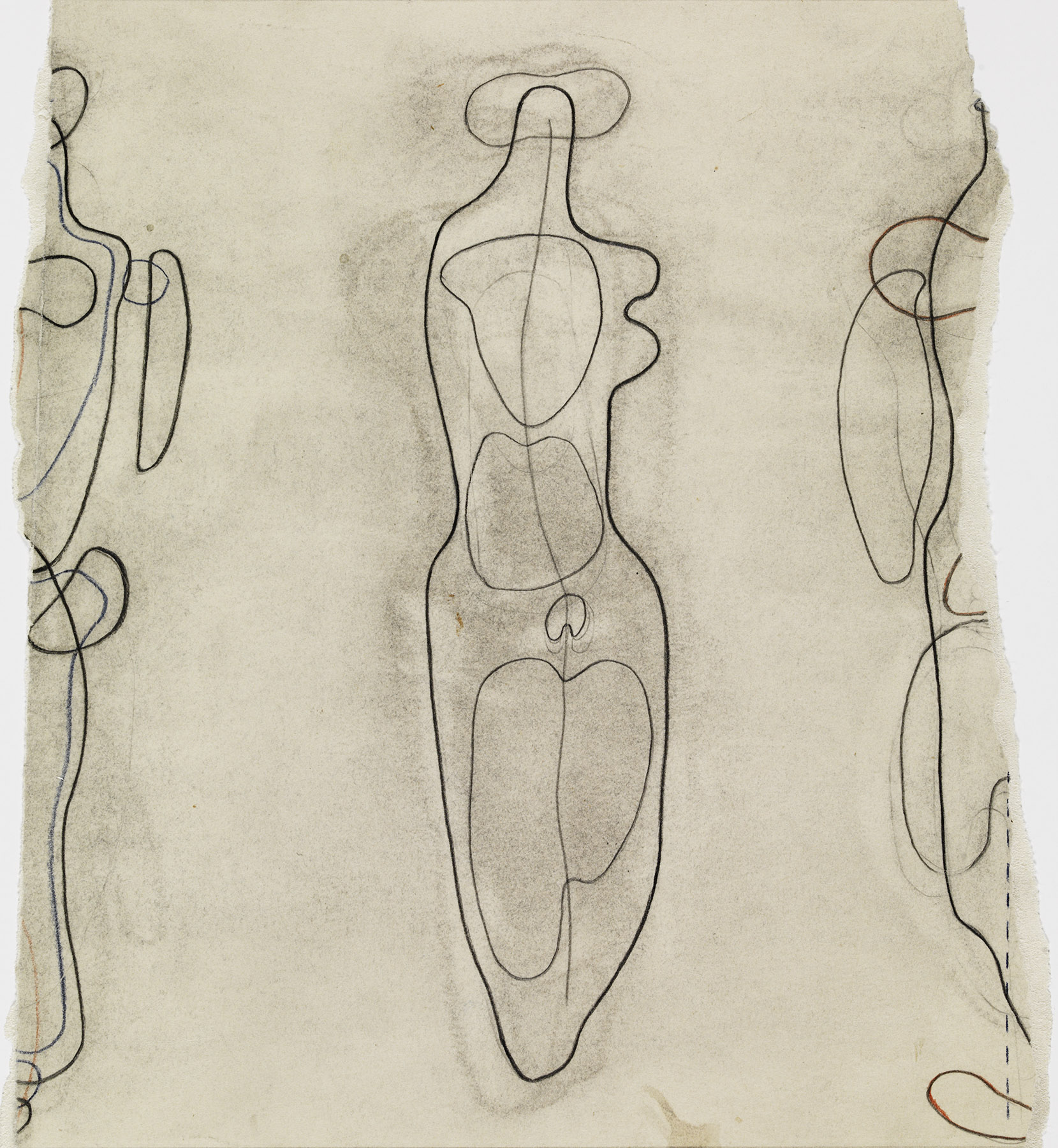 Bleistift, Kohle, gewischt, Ritzkonturen, fixiert, auf chamoisfarbigem, am Rand o. und u. perforiertem Zeichenkarton, am Rand l. und r. ungleichmäßig gerissen, dadurch zwei anschließende Figuren zerstört, bei denen zusätzlich roter und blauer Farbstift ve