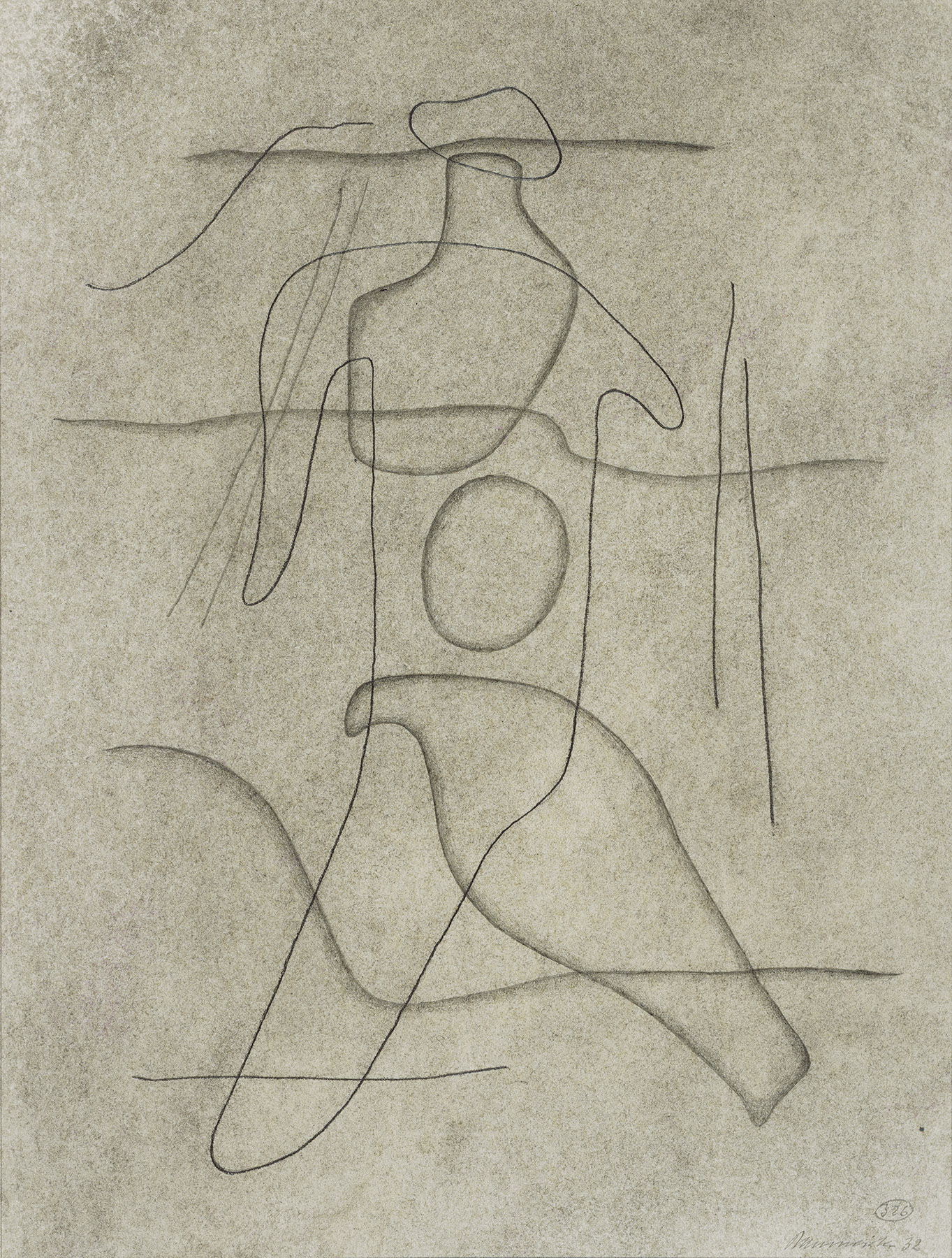 Bleistift, Kohle, gewischt, fixiert, Konturen eingeritzt, Einfassungslinien (u. zweifach), auf chamoisfarbigem, am Rand l. perforiertem Zeichenkarton