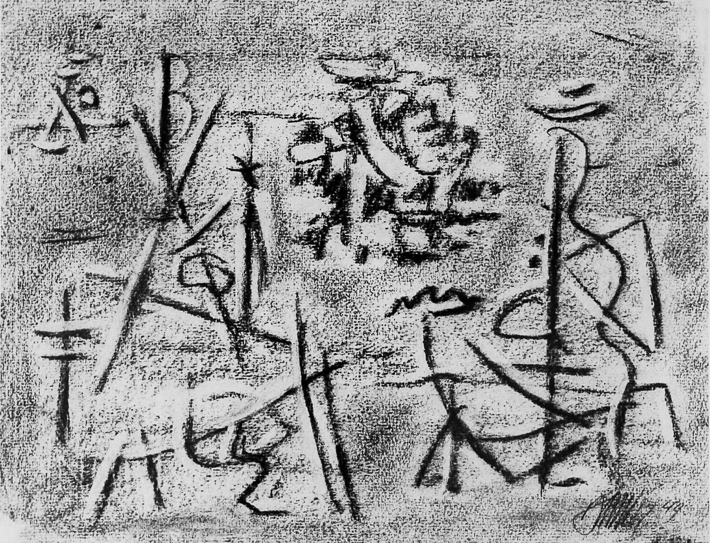 Kohle, gewischt, radiert, Pastell in Orange, Braun, Blau, fixiert, auf chamoisfarbigem Ingres-Bütten