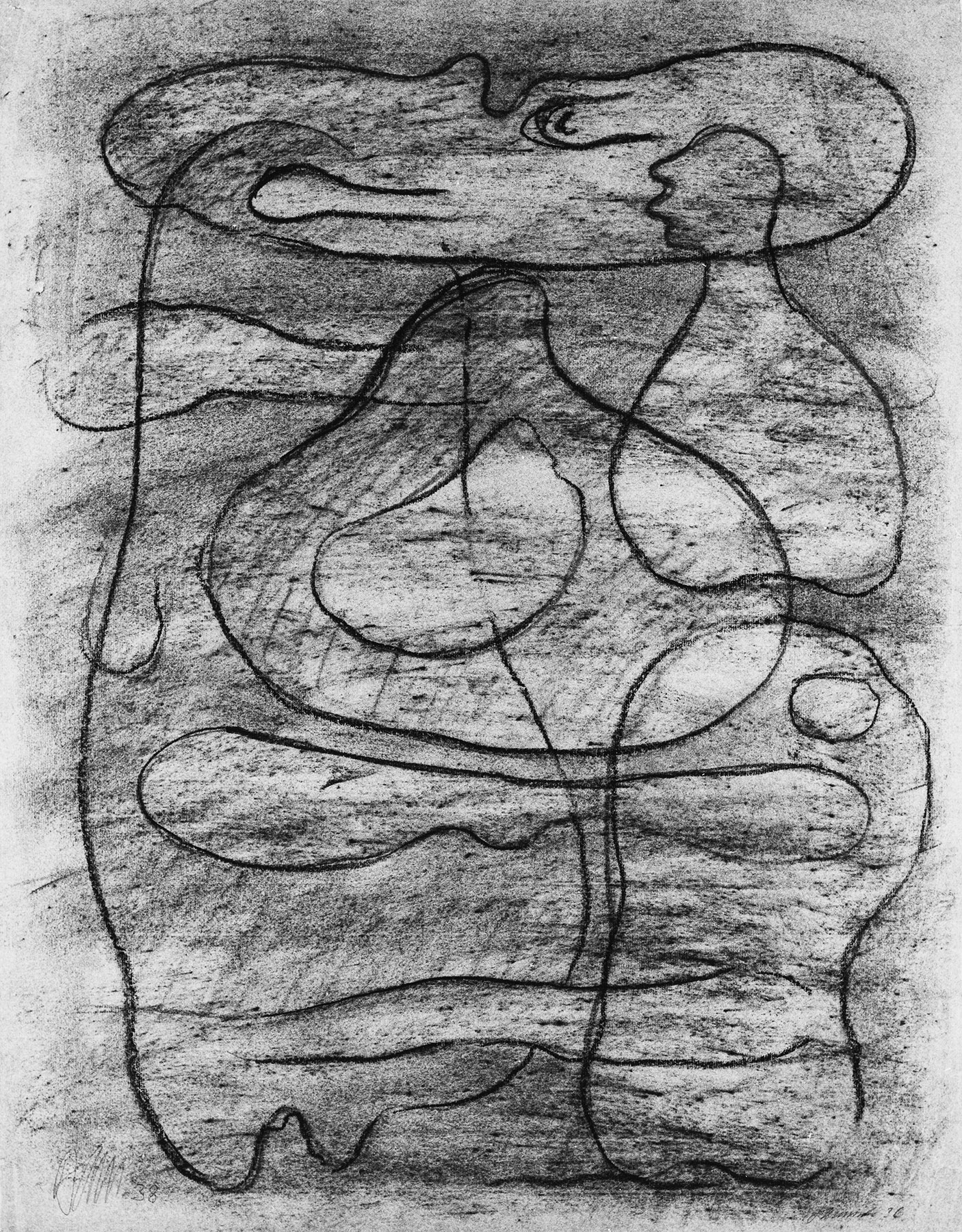 Kohle, gewischt, Ölkreide in Schwarz, Blau, Grün, Rot, Orange, Violett, fixiert, auf blauviolettem, hellem Ingres-Bütten mit Wz. r. u.: Hahn im Kreis