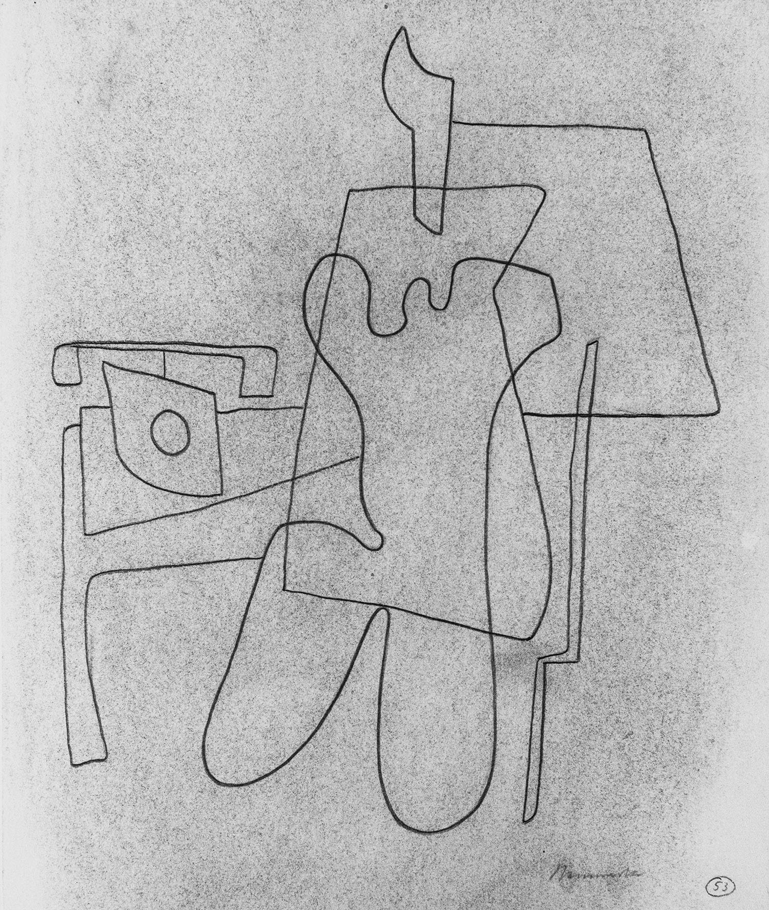 Bleistift, Farbstift in Violett, Kohle, leicht gewischt, Linien mit hartem Bleistift vorgeritzt, auf chamoisfarbigem Zeichenkarton