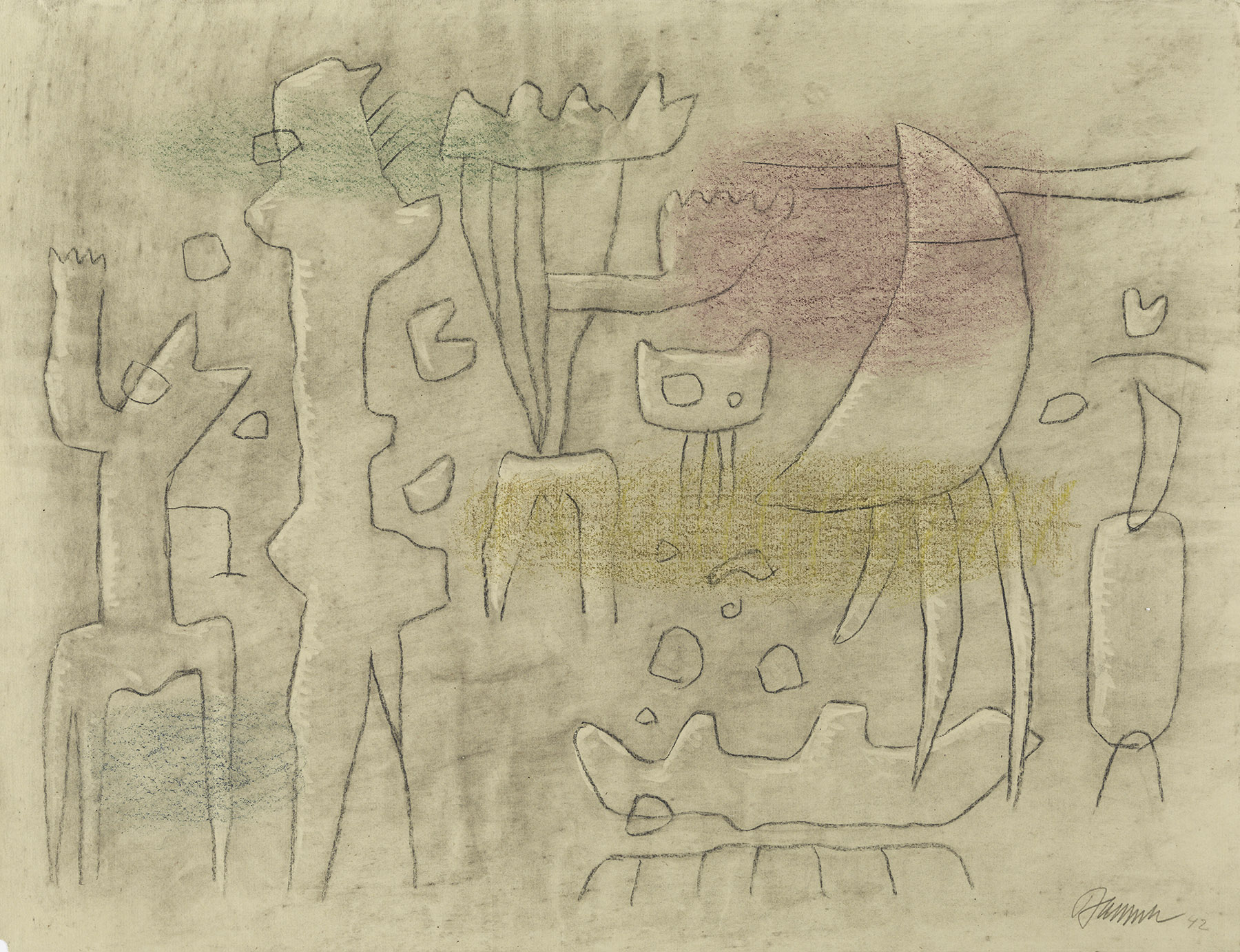 Kohle, gewischt, radiert, Ölkreide in Rot, Grün, Blau, Gelb, fixiert, auf beigefarbigem Ingres-Bütten mit Wz. r. o.: FS handgeschöpft