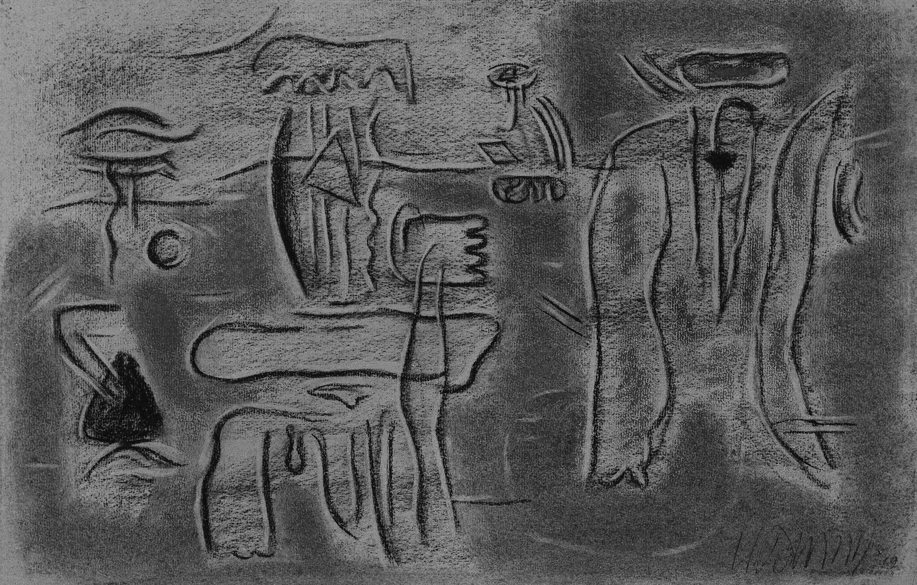 Kohle, z. T. gewischt, radiert, Pastell in Graublau, Rotbraun, Grün, z. T. gewischt, radiert, fixiert, auf olivgrünem, am Rand o. leicht unregelmäßig abgetrenntem Ingres-Bütten mit Wz. r. u.: PMF (ITALIA)