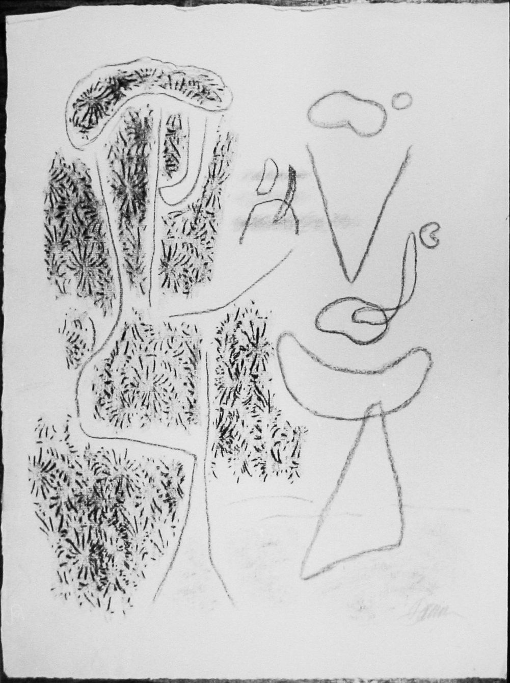 Kohle, Ölkreide in Schwarz, durchgerieben, Gelb, Grün, Blau, Rot, Braun, fixiert, auf lindgrünem Ingres-Bütten