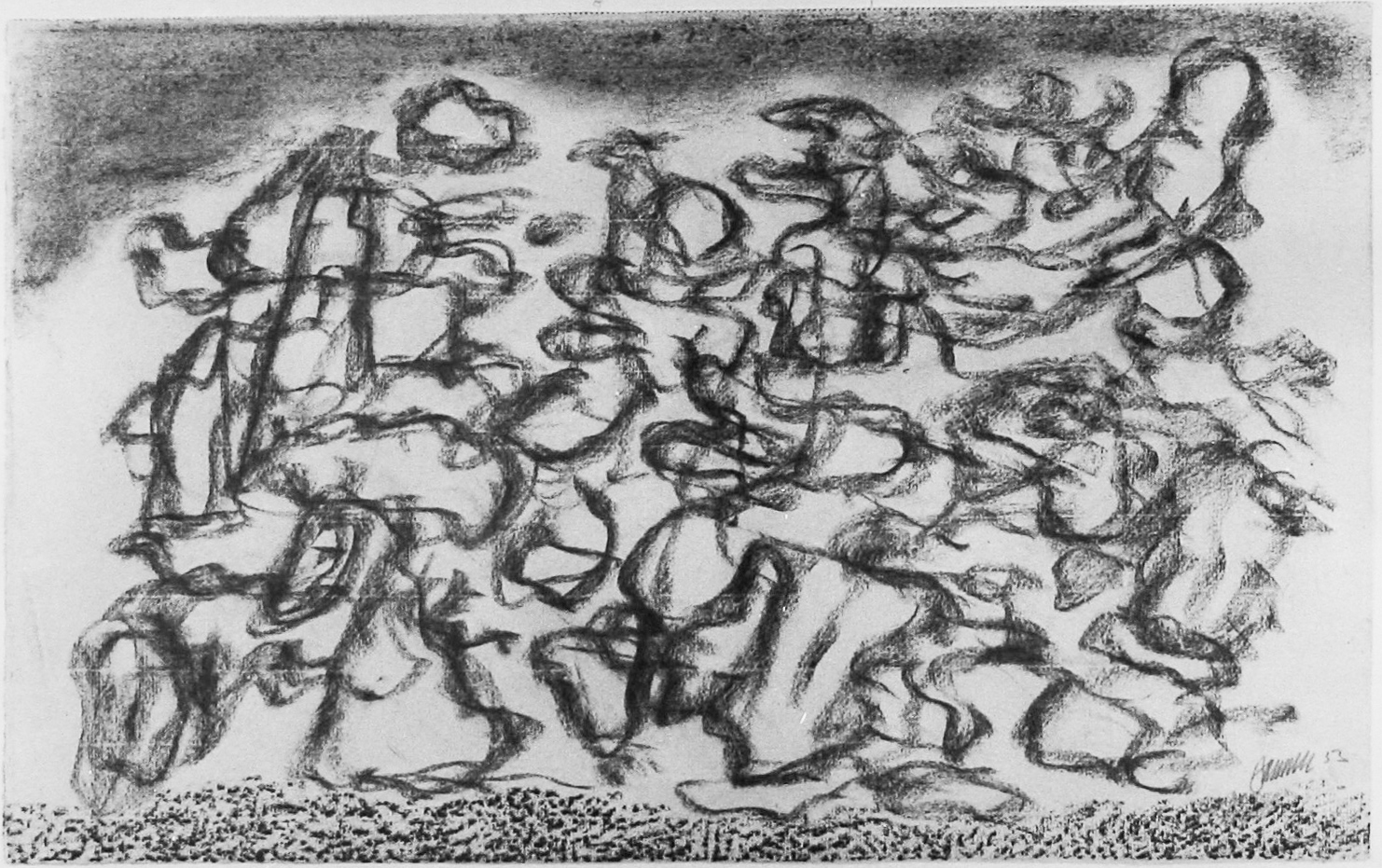 Kohle, Ölkreide in Schwarz, durchgerieben, Pastell in Braun, gewischt, fixiert, auf chamoisfarbigem, am Rand o. perforiertem Ingres-Bütten