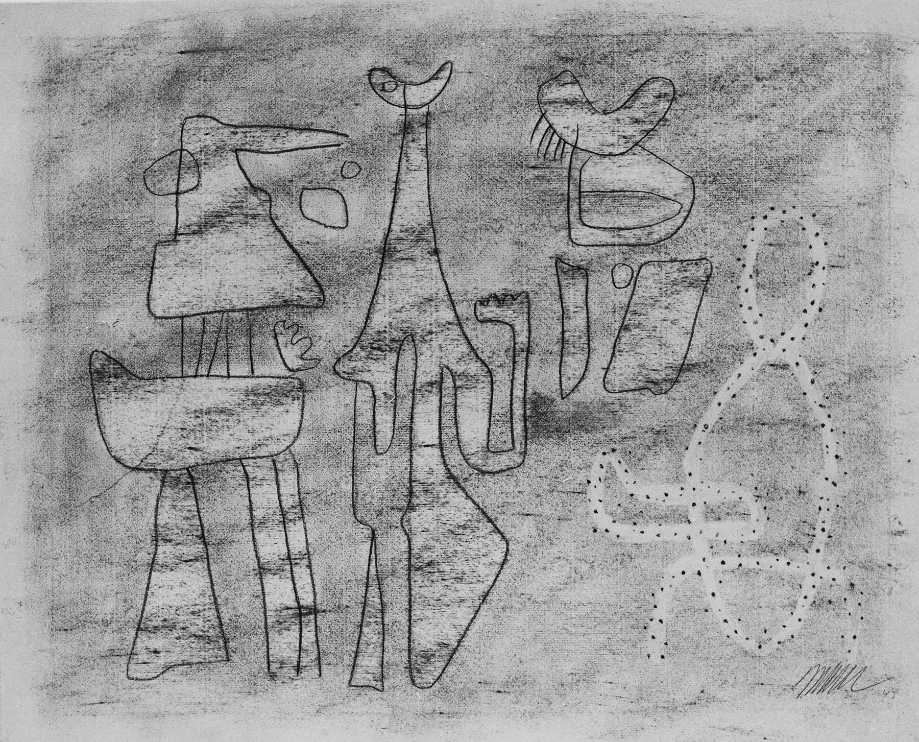 Kohle, gewischt, radiert, Ölkreide in Schwarz, Rot, Grün, Blau, Ocker, fixiert, auf chamoisfarbigem Ingres-Bütten