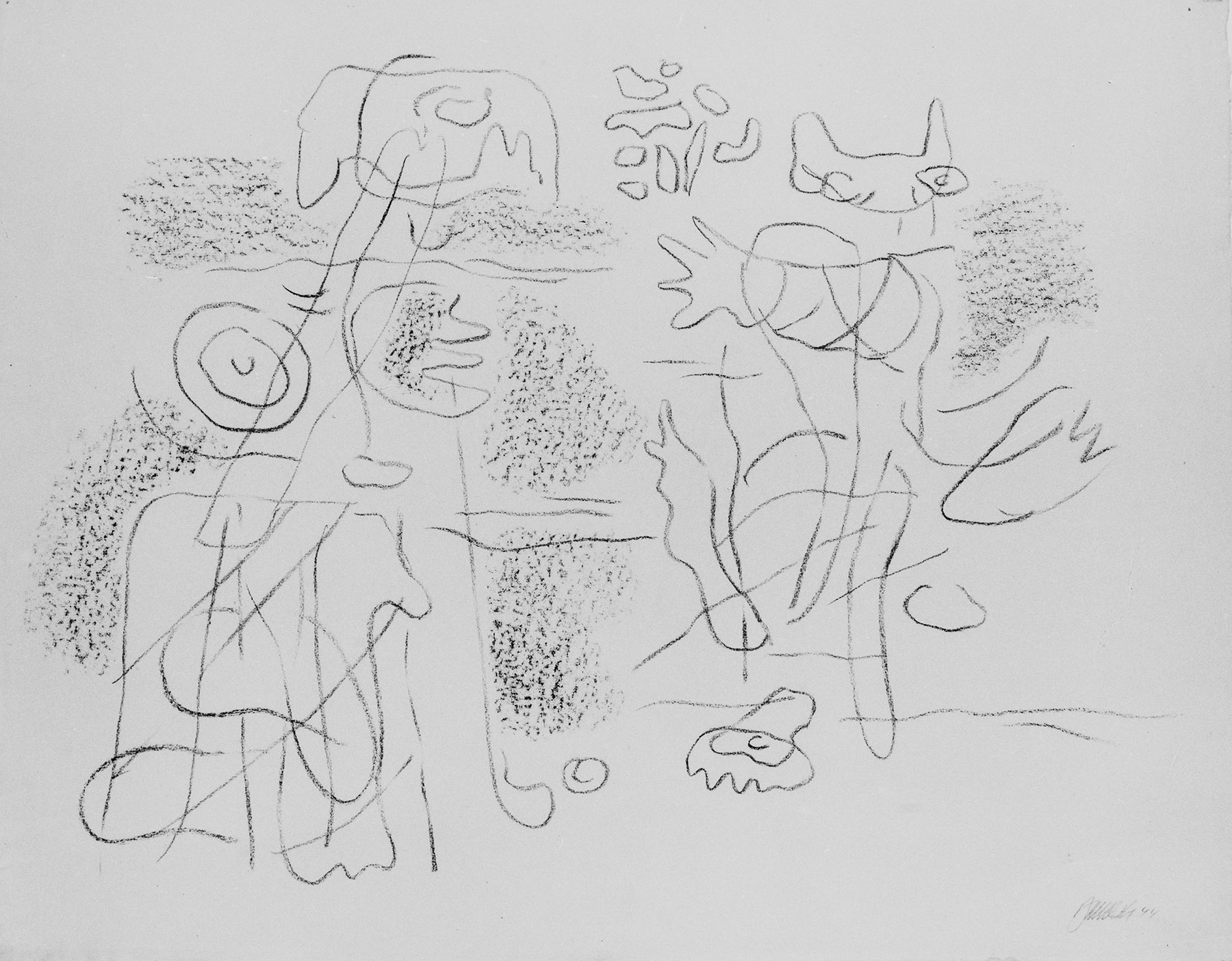 Kohle, Ölkreide in Braun, Blau, Rotbraun, durchgerieben, fixiert, auf chamoisfarbigem Ingres-Bütten