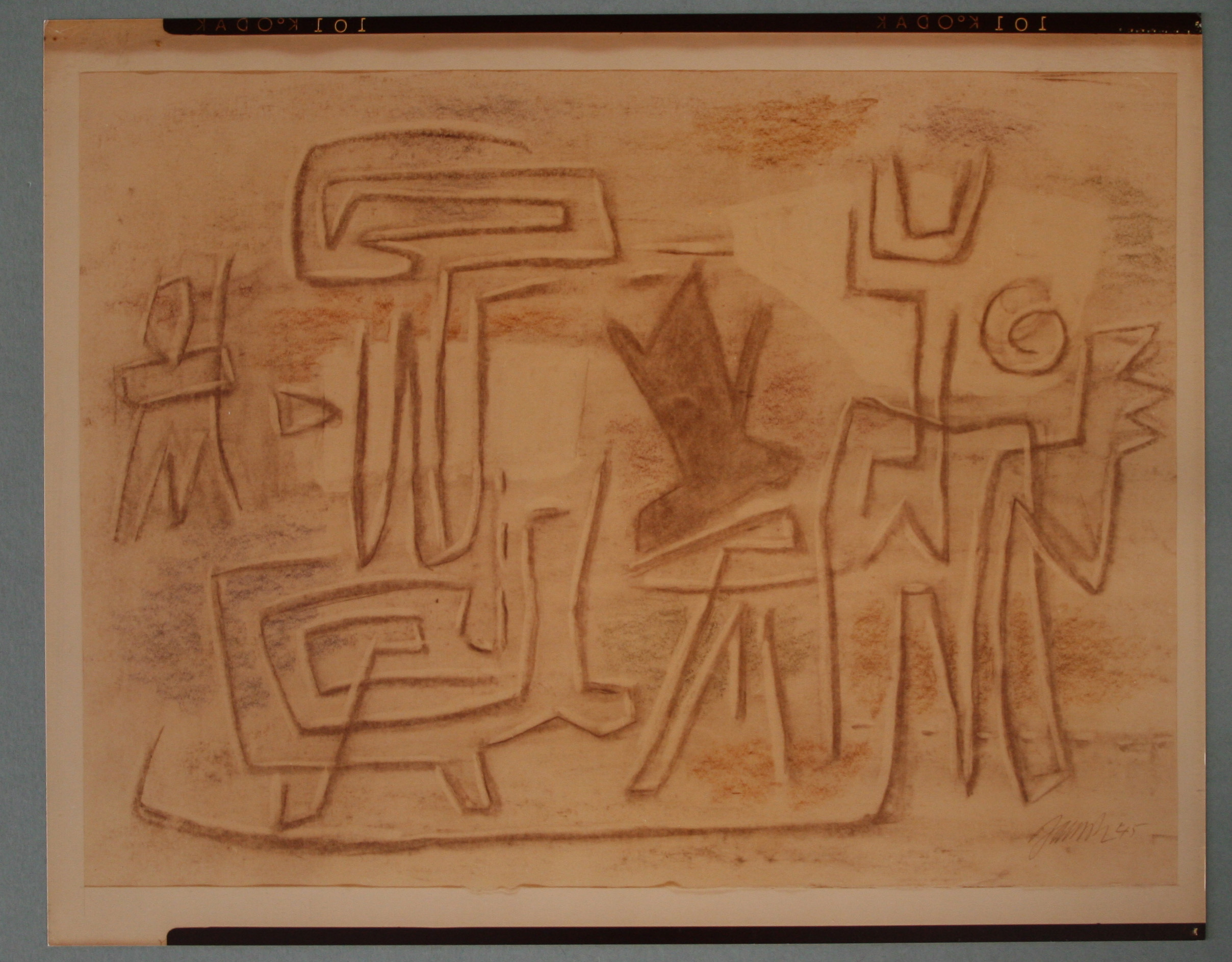 Kohle, gewischt, radiert, Farbkreiden, auf gelblichem Bütten