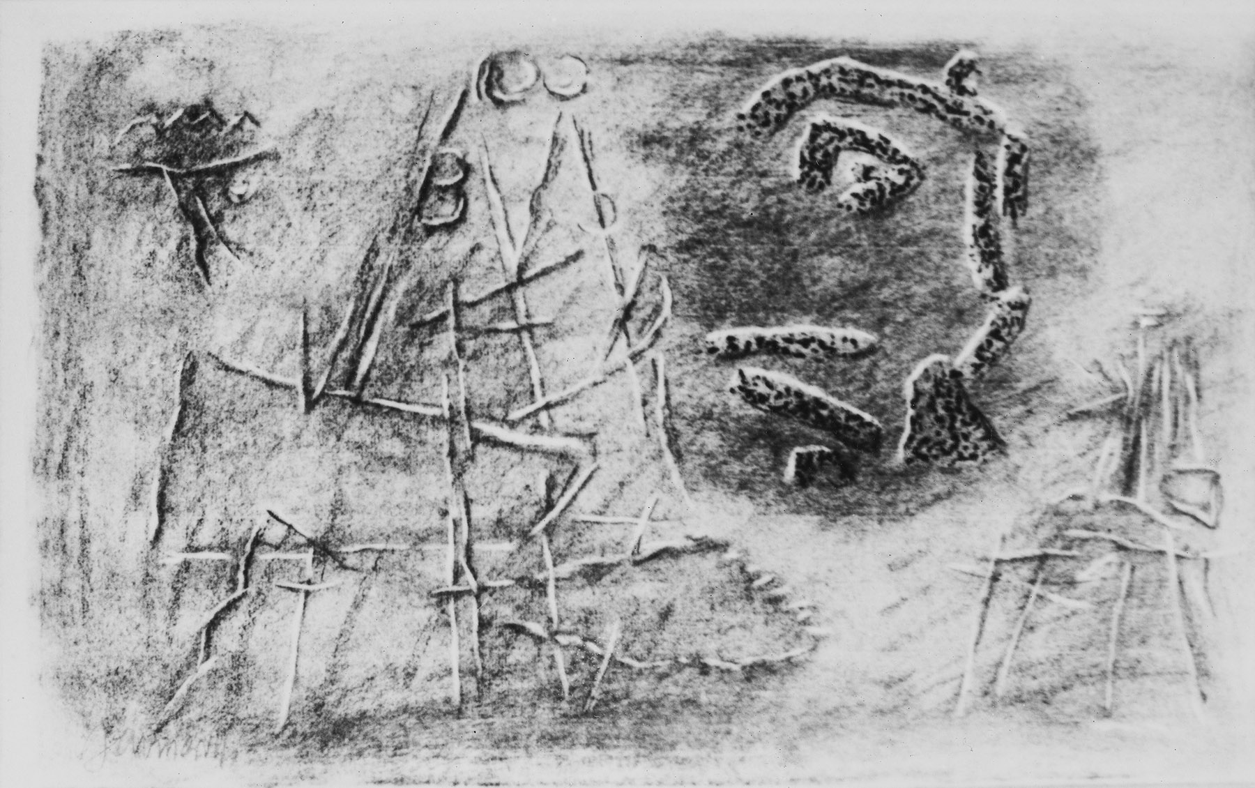 Kohle, gewischt, radiert, Ölkreide in Schwarz, durchgerieben, auf Bütten