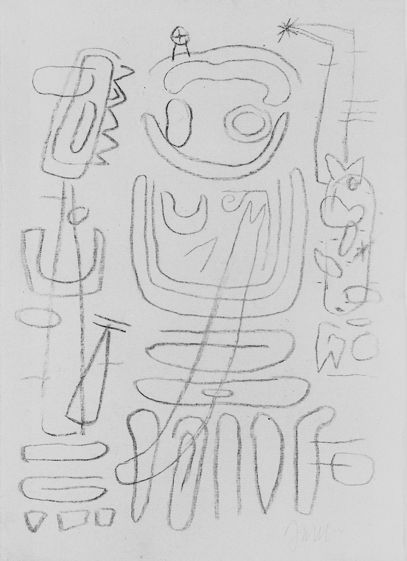 Bräunung durch Fixativ besonders am Rand l. . Rand l. durch Abtrennen im scharfen Knick leicht ausgefranst. Ecke r. o. und l. u. verknickt.