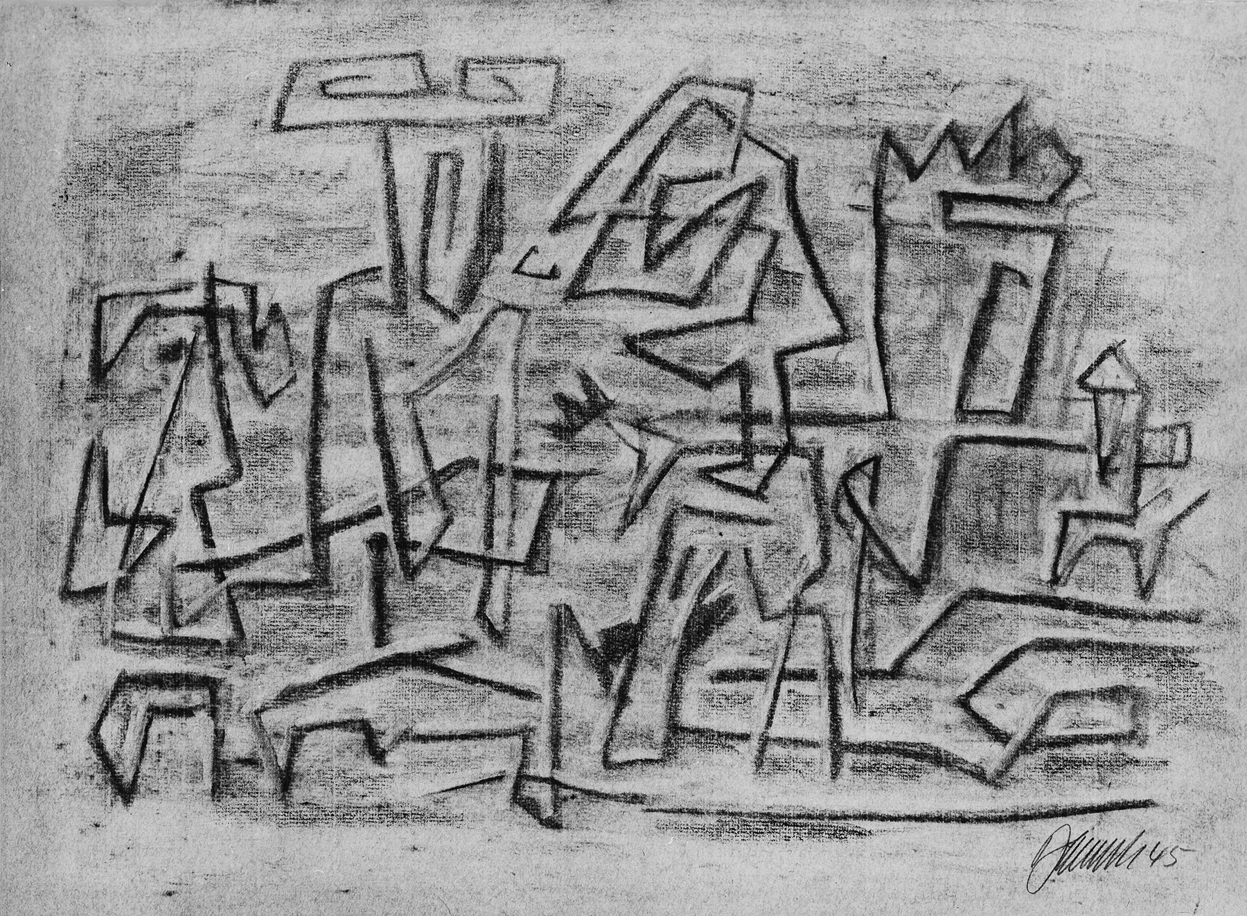 Kohle, gewischt, radiert, Ölkreide in Rot, Blau, Gelb, Grün, Ocker, fixiert, auf lichtblauem Ingres-Bütten mit Wz. r. o.: INGRES