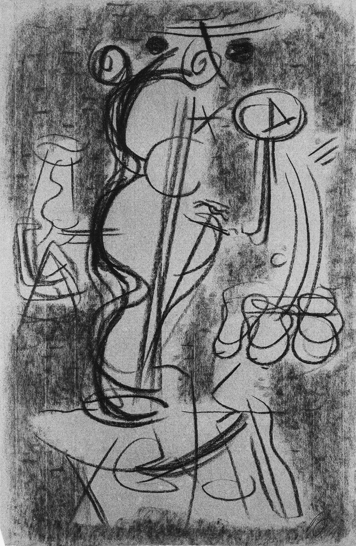 Kohle, z. T. gewischt, Ölkreide in Schwarz, Pastell in Gelb, Orange, fixiert, auf graugrünem Ingres-Bütten mit Wz. r. o.: INGRES