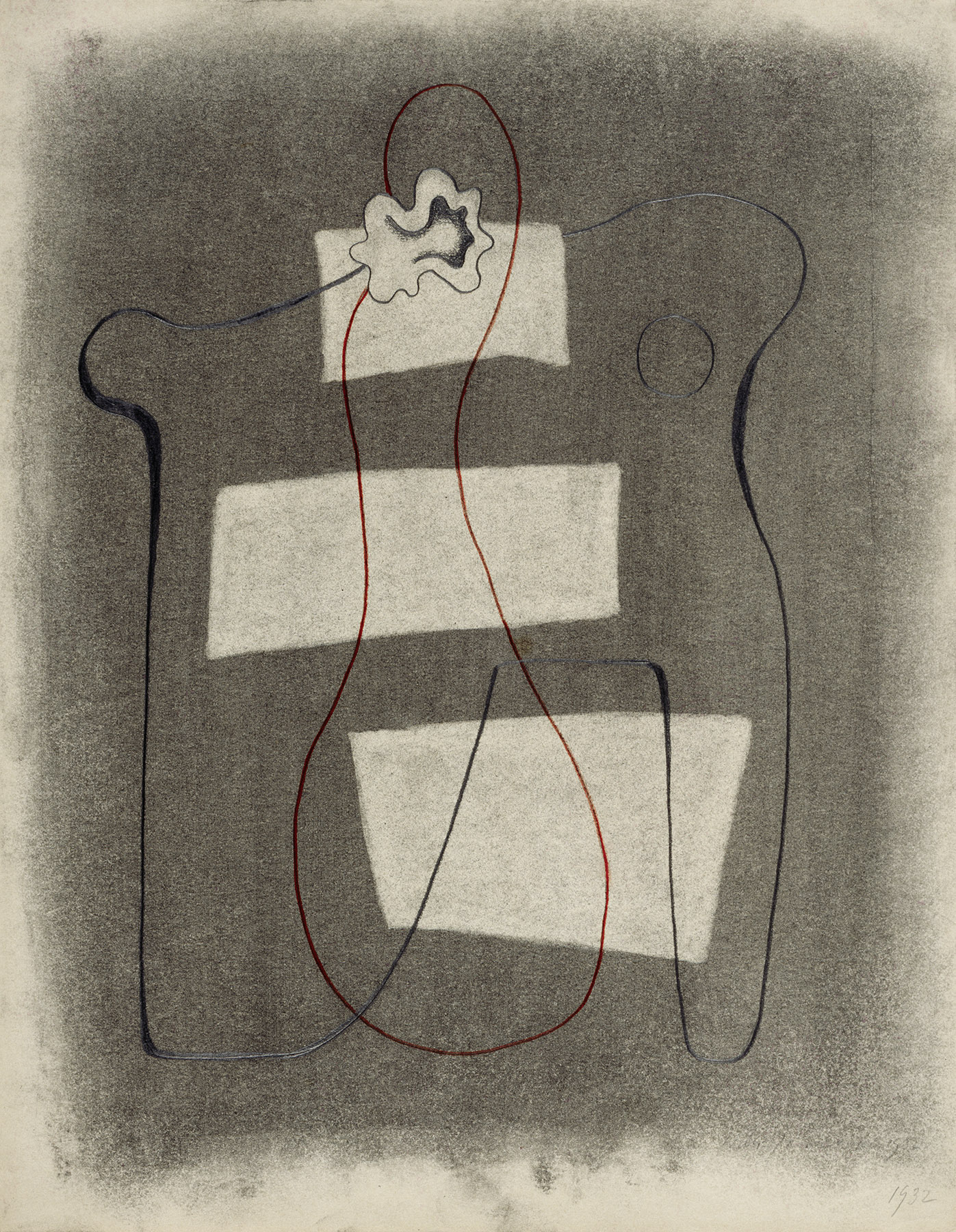 Bleistift, Kohle, gewischt, fixiert, Farbstift in Rot, Konturen vorgeritzt, auf chamoisfarbigem, am Rand l. perforiertem Zeichenkarton